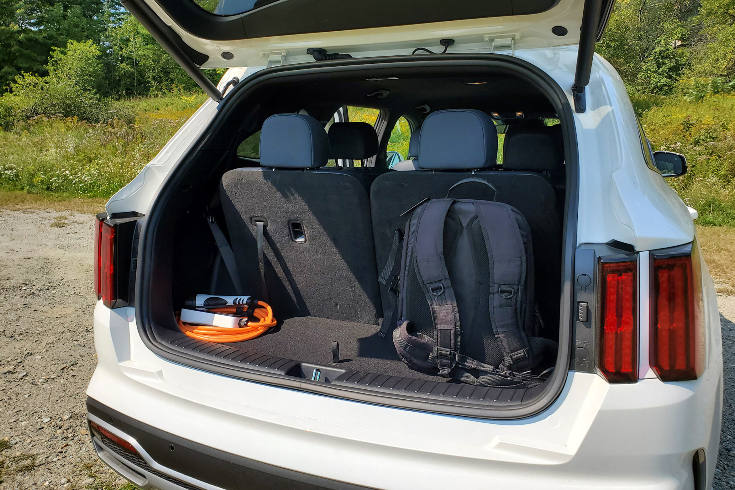 The price of all that passenger roominess, however, is trunk space. At 12.6 cubic feet with the third row of seats upright, the plug-in Sorento’s cargo room is pretty pathetic. I had some trouble fitting my camera backpack in it. So, it’s one or the other. You can either ferry around five other people and hardly any stuff, or you can ferry around only three other people but a ton more stuff.