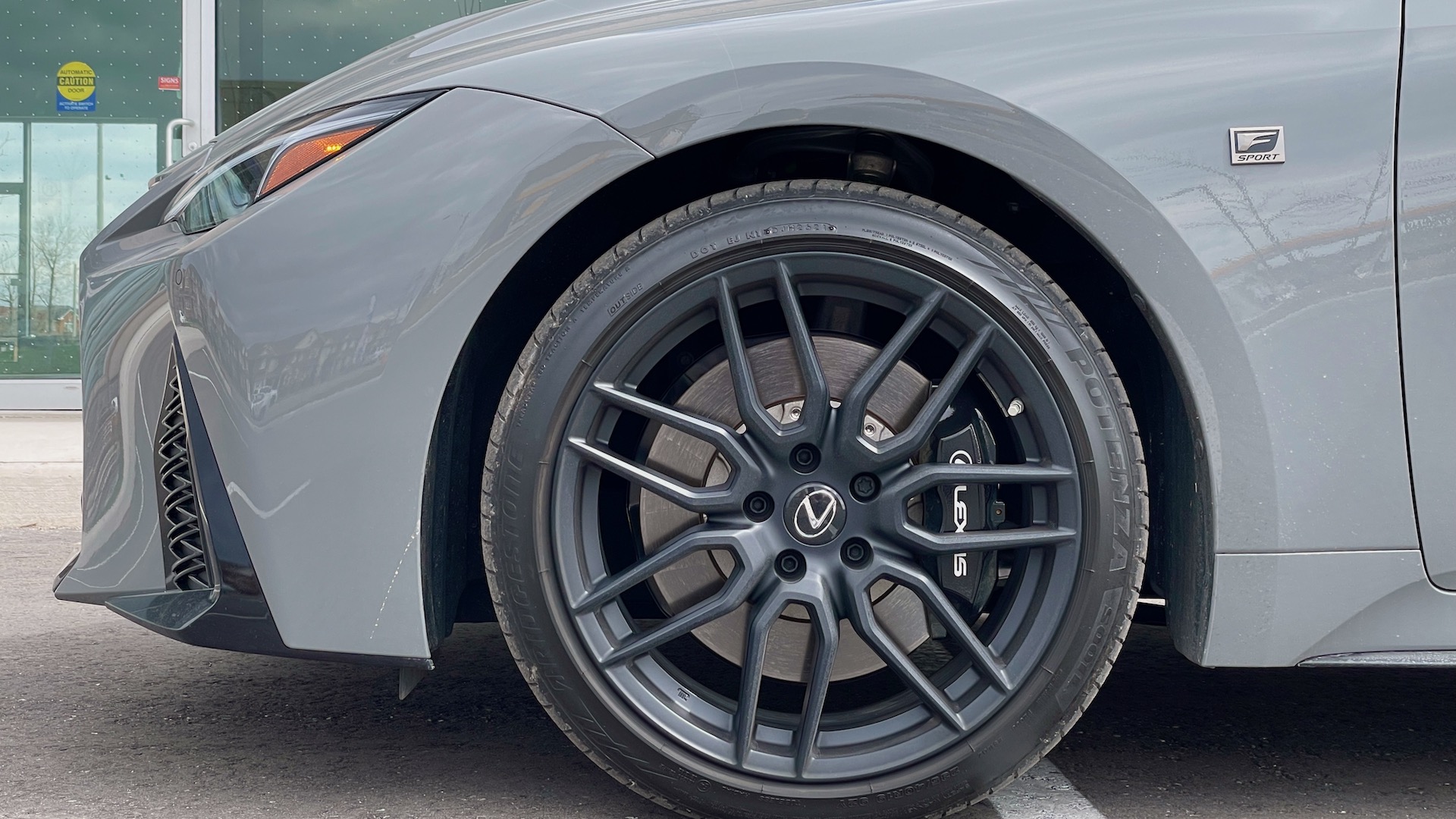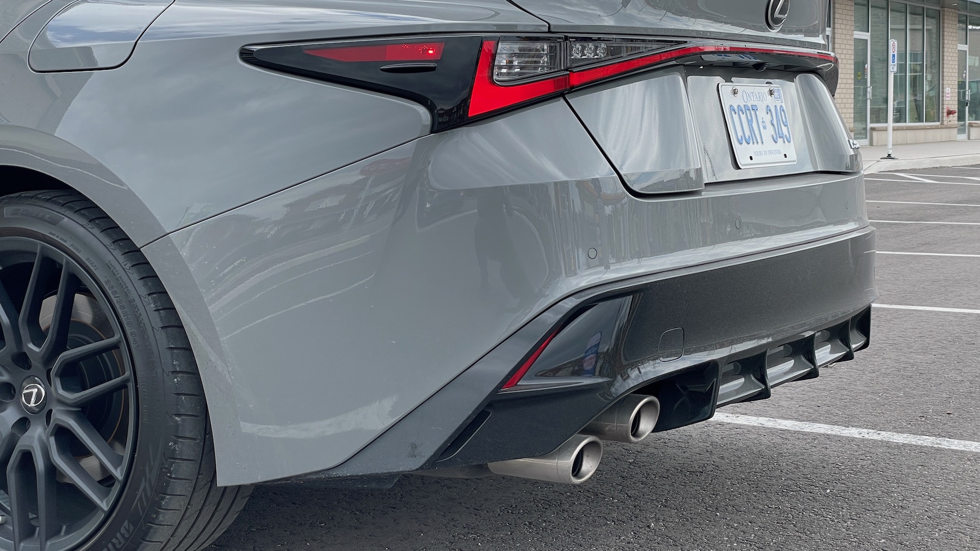 IS500-exclusive aesthetic parts include lighter, 19-inch Enkei wheels, a small lip spoiler, darker window trim, and a more aggressive rear diffuser that houses stacked quad exhaust tips. These are actually attached to pipes, by the way, and not a phony bumper garnish like on the old IS F.