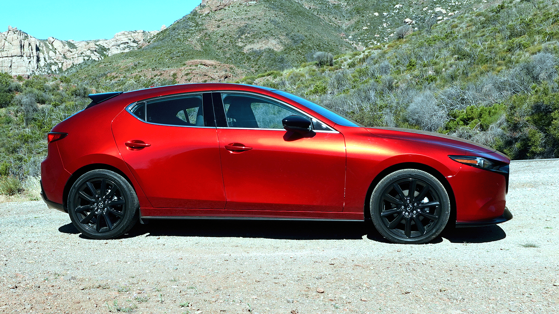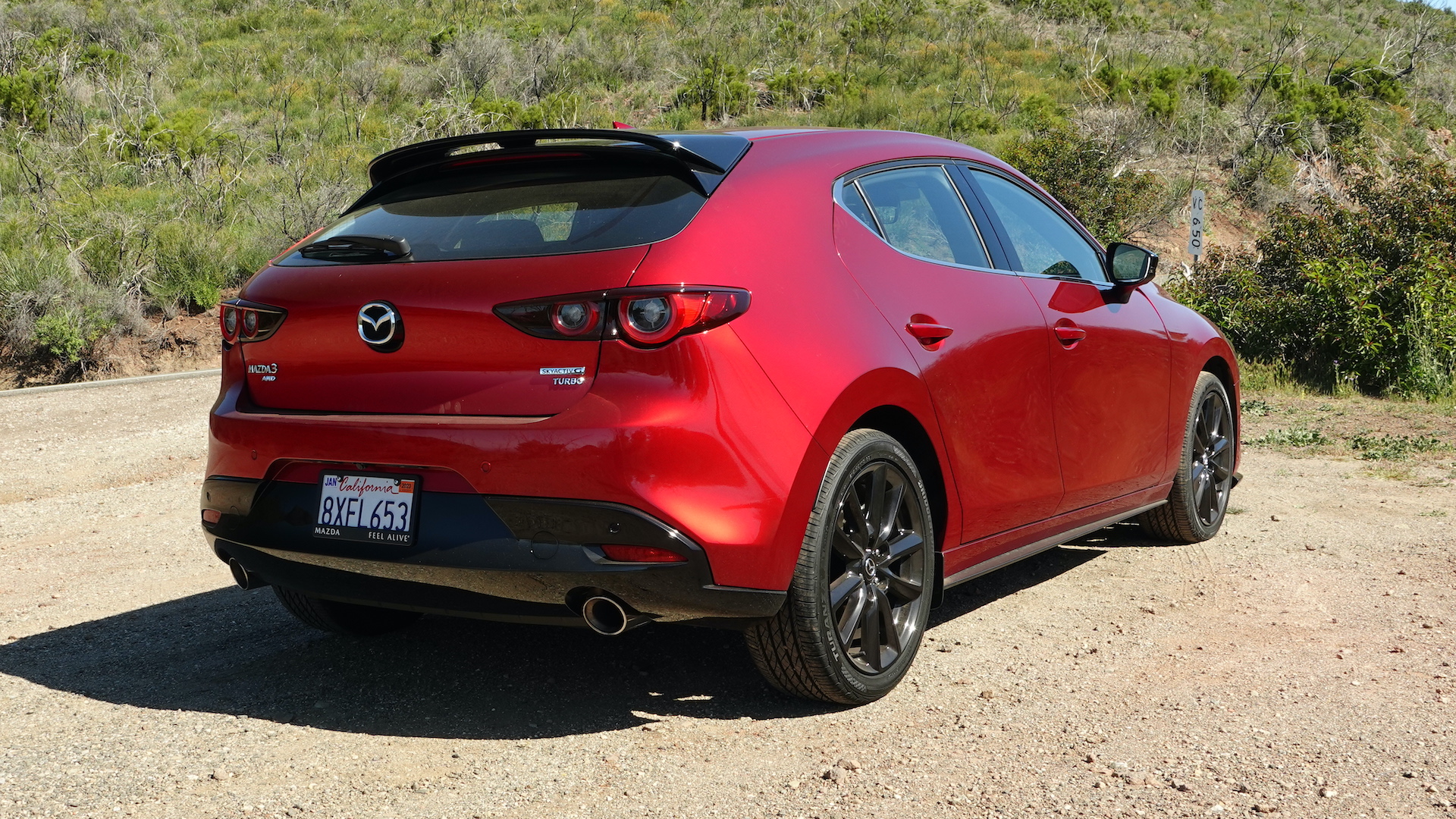 First, it’s the top step in the Mazda 3 line, which starts with a 155-horsepower, 150 lb-ft, 2.0-liter SKYACTIV four in the standard model (now only available in the sedan). Mazda 3 hatchbacks all get a 2.5-liter version, which produces 186 horsepower and 186 lb-ft in the S, which can be had with a six-speed manual in front-wheel drive. The Mazda 3 Turbo, which is automatic-only, gets the full treatment: turbocharged 250 hp and 320 lb-ft on 93 octane (or 227 hp, 310 lb-ft on 91 octane).