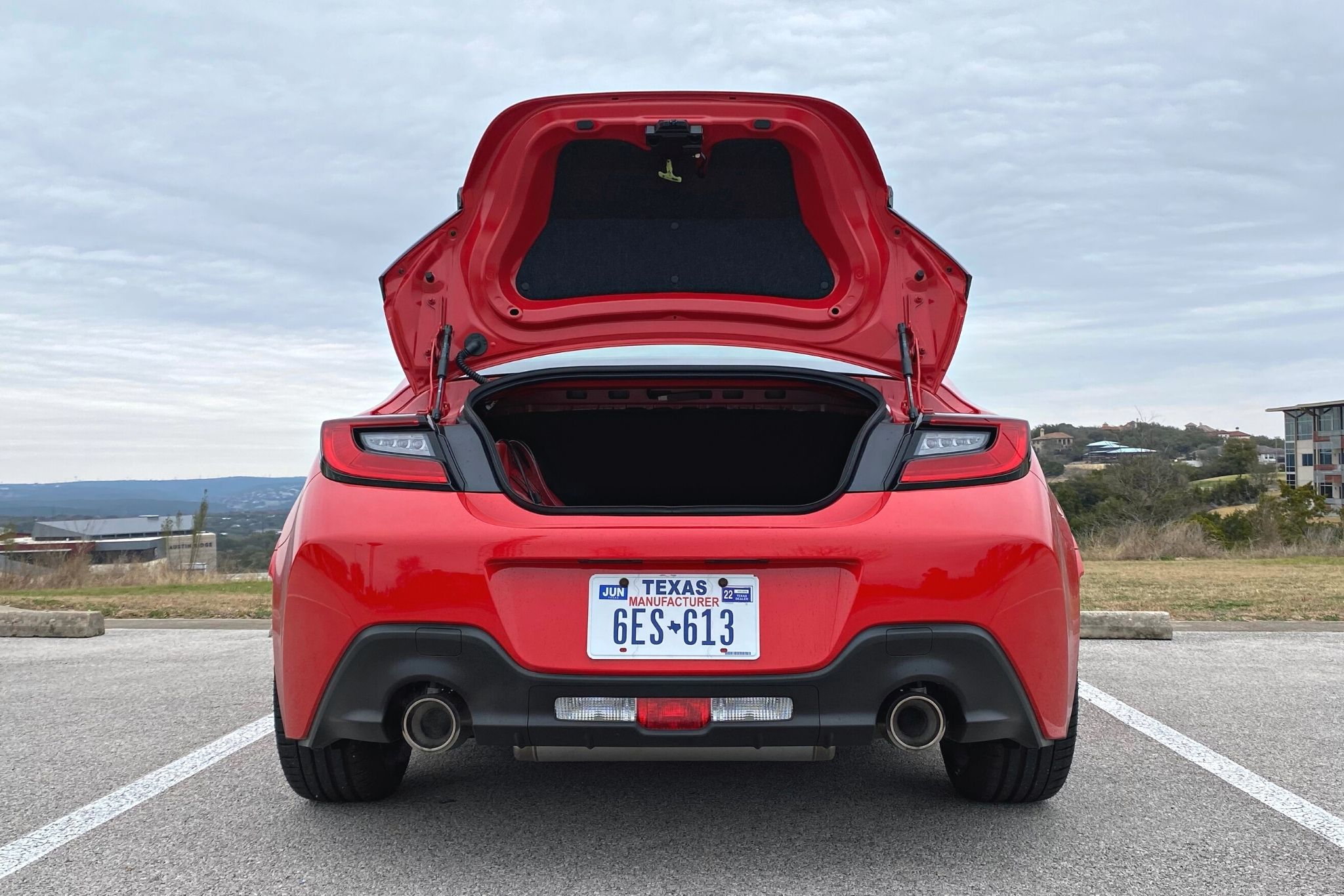 The Gazoo engineers added new rebound springs that serve a dual purpose: they protect the piston rods from damage by providing extra cushioning, which results in a better ride. Toyota also refined the sport-tuned MacPherson front struts, which improved the handling over the outgoing model. As a result, the ride quality was excellent while I was driving it around town; I glided up and down the hills of the Westlake neighborhood of Austin with no noticeable body roll. Other reinforcements to the rear shock absorbers and strut stabilizer bar firmed it up even more. But far from being too stiff, the GR86 drove like an exuberant puppy—one that has already been through obedience school. The steering was communicative and balanced, and I didn’t feel any unwanted drift or pull. On the highway, the little car jumped forward, easily dusting other less-spirited vehicles in my wake before settling into greatness in fifth and sixth gear.