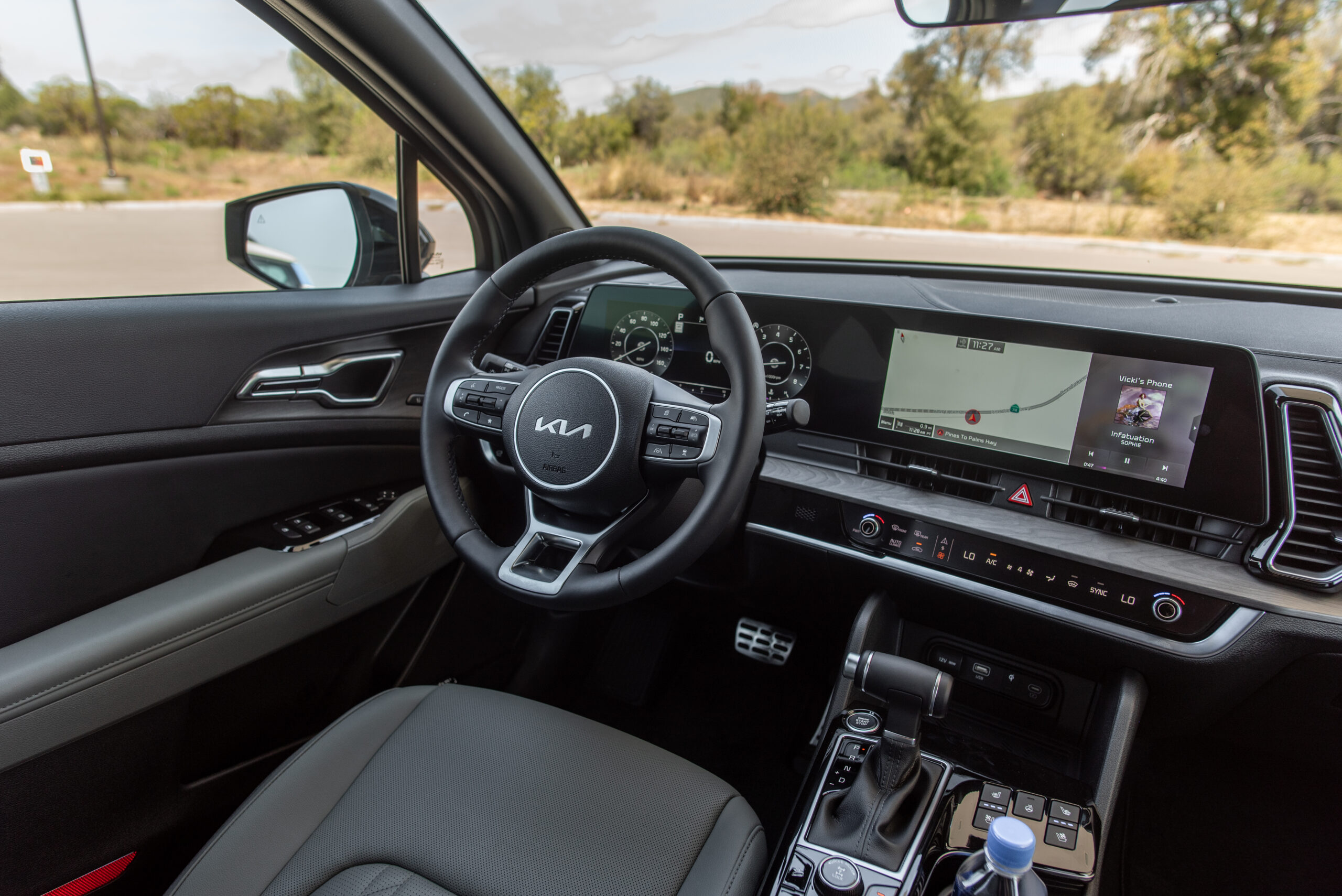 Lean into the gas, and it doesn’t get any better; the 2.5-liter gas motor is one of the only modern units I’ve actually felt was too anemic to recommend. You will never see me kneeling at the altar of the almighty stat sheet, especially for a two-row crossover that starts at around $25,000, but I also need to merge and the Sportage made that more challenging than any car produced in the model year of our Lord two-thousand twenty-three should. The eight-speed shifts smoothly and comfortably, but with the cruise control engaged at 78 mph into a strong headwind through the valleys of Palm Springs, California, it began hunting for gears as the 178 lb-ft of torque wasn’t enough to keep consistently pushing the Sportage forward. Given that I had to be so heavy on the gas just to get the Sportage moving, the EPA’s 25-mpg rating seems a bit overly optimistic for realistic driving.