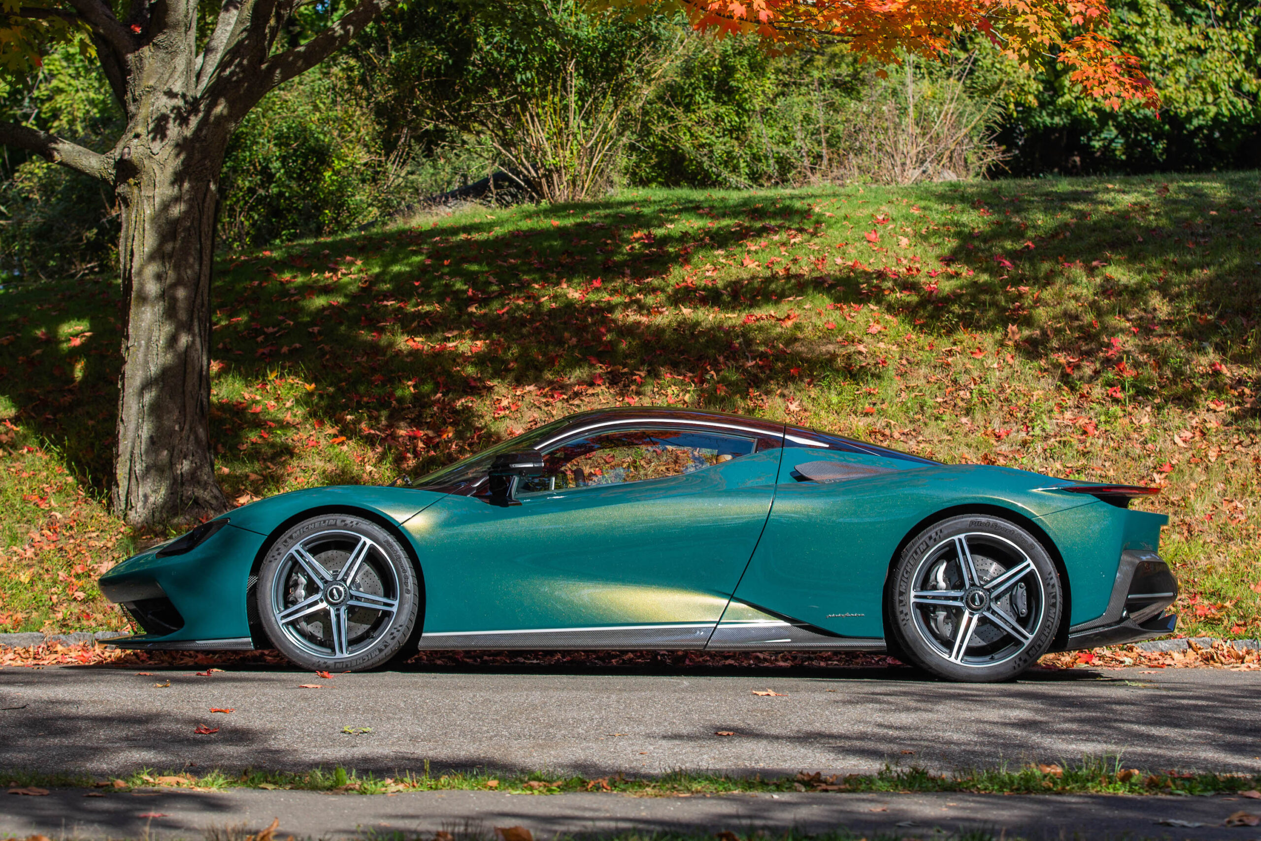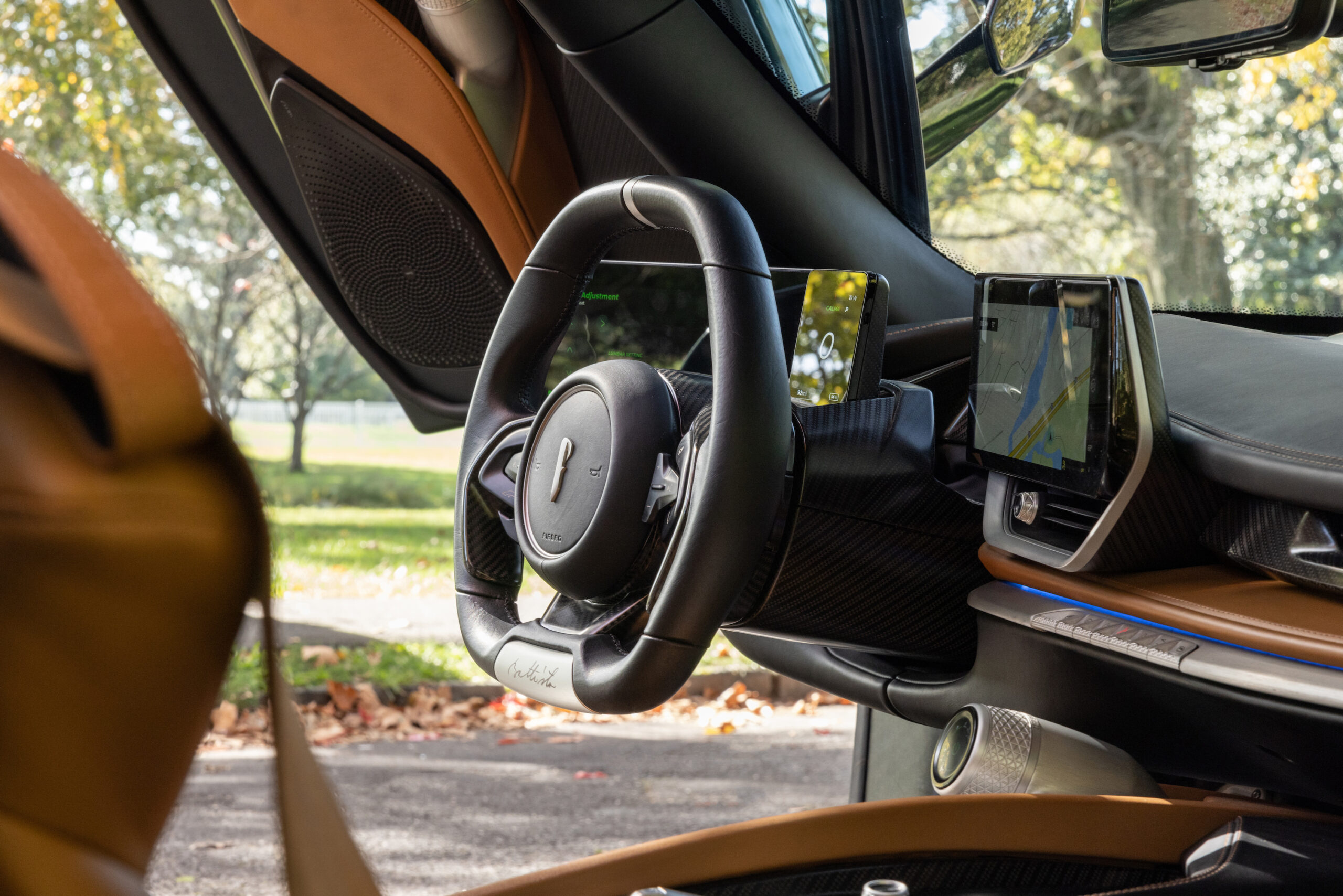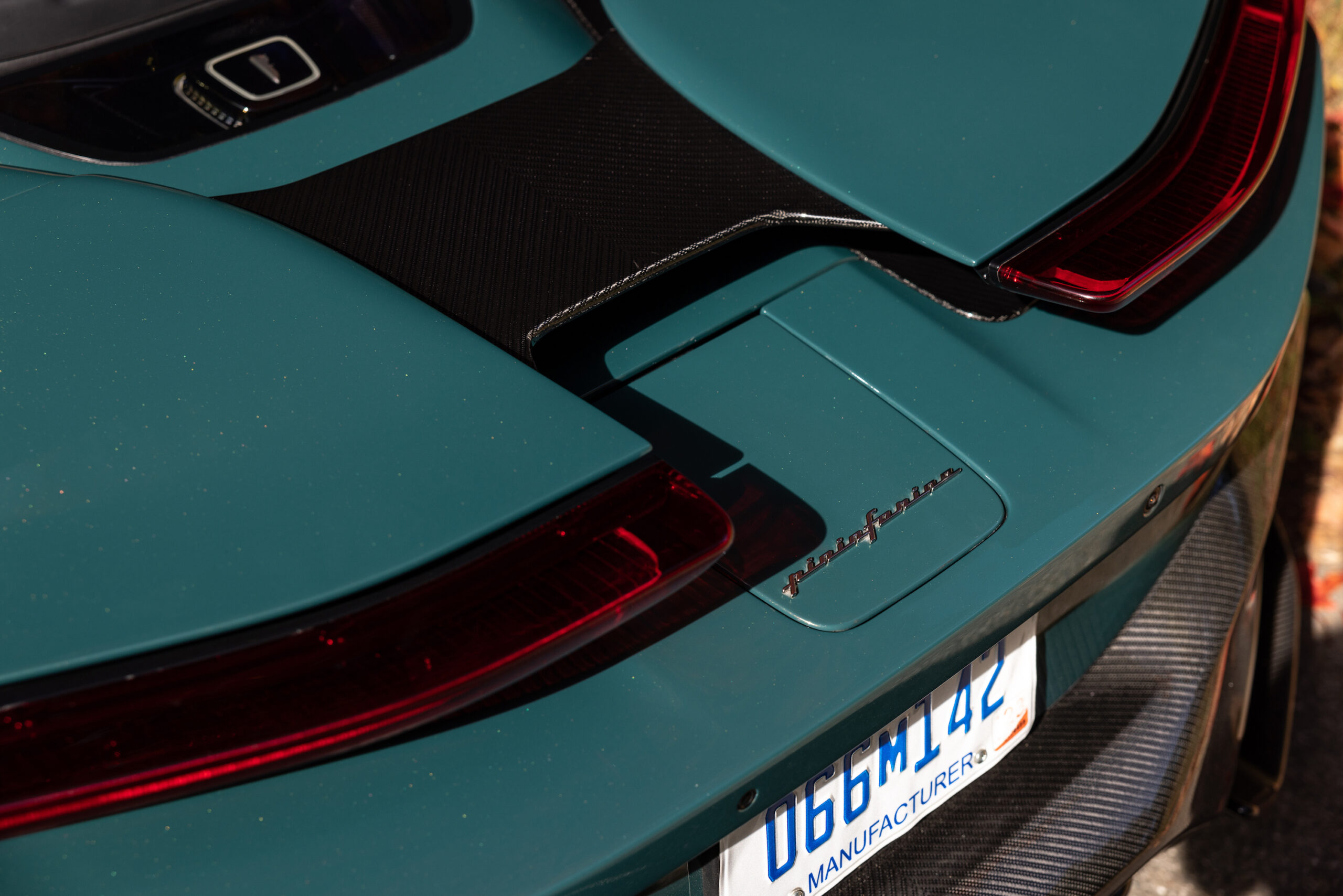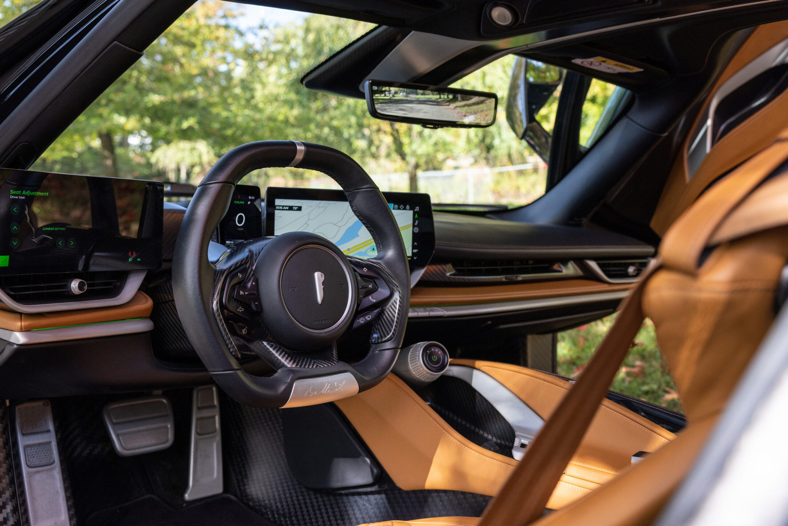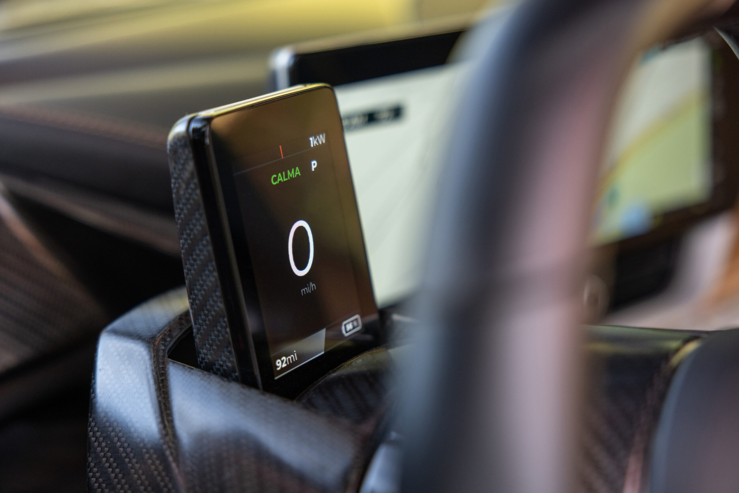 A series of whirs and growls emanated from it constantly. The sticky tires grabbed dozens of tiny rocks and flung them up in the wheel wells, where they clattered off the carbon fiber like a rain rattle. Upon slowing down, there was a buzzing sound that a Pininfarina engineer explained was a sort of “anti-drag” feature that smooths out the transition of regen braking. One-pedal driving becomes instinctive to use, though when I did go to use the physical brake pedal, the bite point was a little difficult to modulate at first because it was so sensitive. Curiously, I also picked up on some very high-frequency feedback while driving the car and couldn’t figure out how to shut it off, but it sounded like one of those frequencies that only people below a certain age can hear.