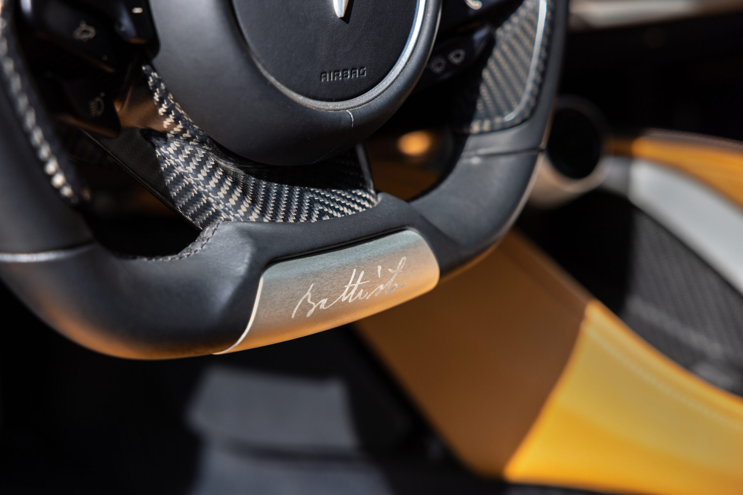 Six-piston front and rear calipers clamp onto a set of 15.4-inch carbon-ceramic Brembo discs that rest behind forged aluminum wheels, which can be had as 20 inches as standard or optionally staggered at 20 inches in the front and 21 inches in the rear. Rubber consists of Michelin Pilot Sport Cup 2R tires, also as standard, and they’re tires a Pininfarina spokesperson said can be sourced through the normal Michelin channels. You don’t have to order a special set that’s bespoke to the Battista, which will surely make replacing them much easier.