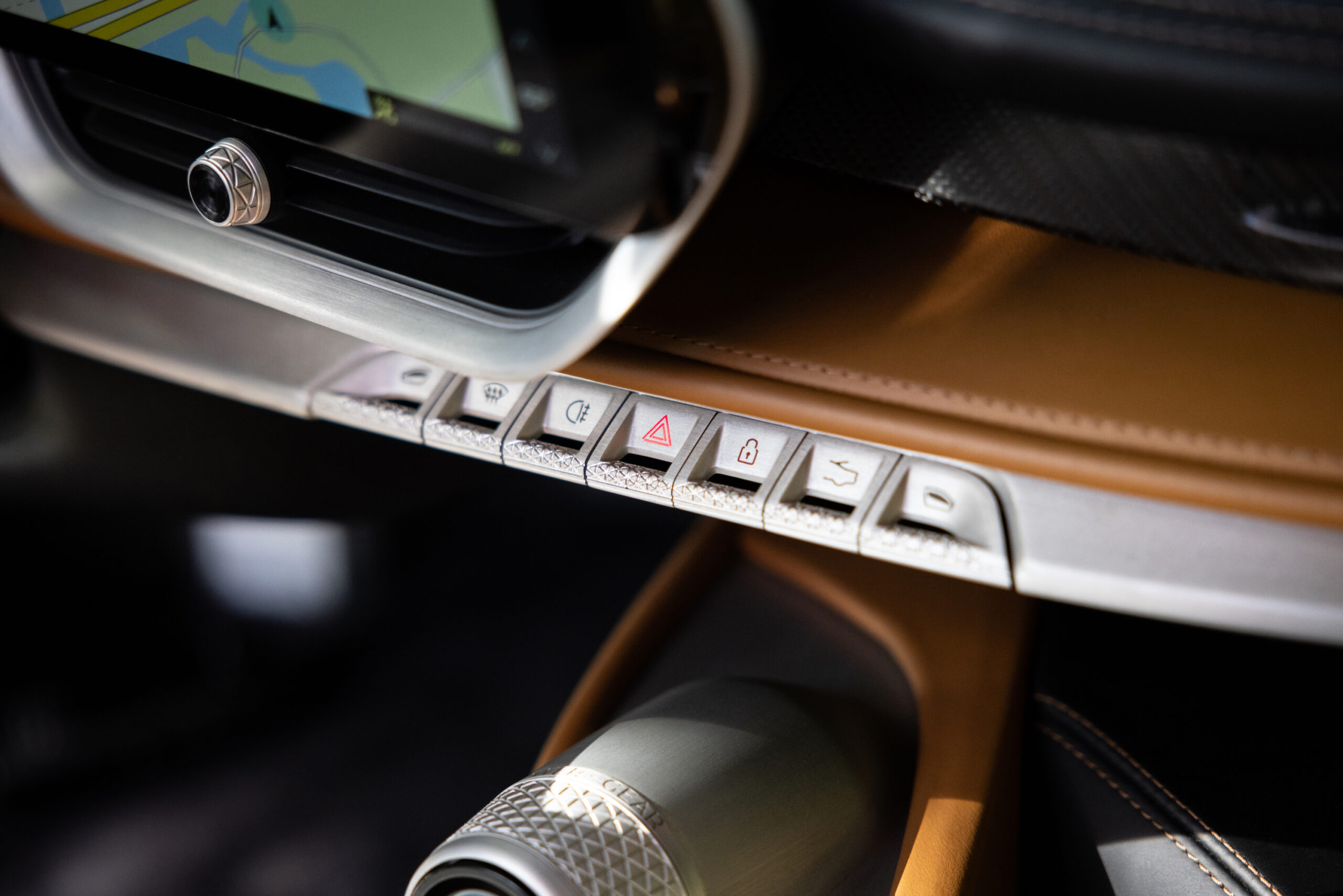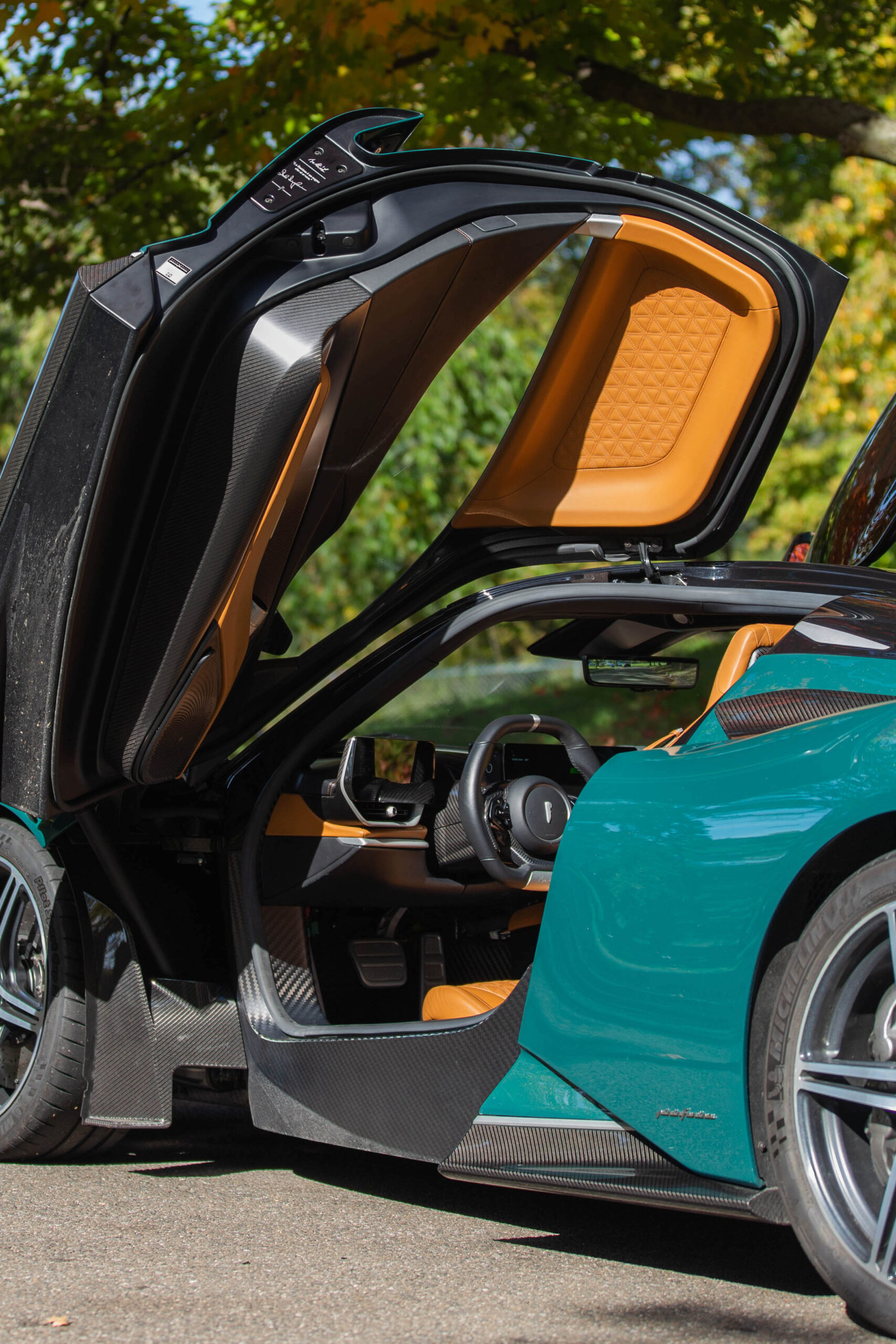 Typically, cars with up-swinging doors and monocoque chassis tend to have very thick sills and low roofs that require a contortionist’s flexibility to climb into their portholes. But not the Battista. Its sills are thin and, most importantly, a cutaway of its roof comes away with its doors. This adds extra headroom useful for when you’re ducking into something so low—just like the original Ford GT.