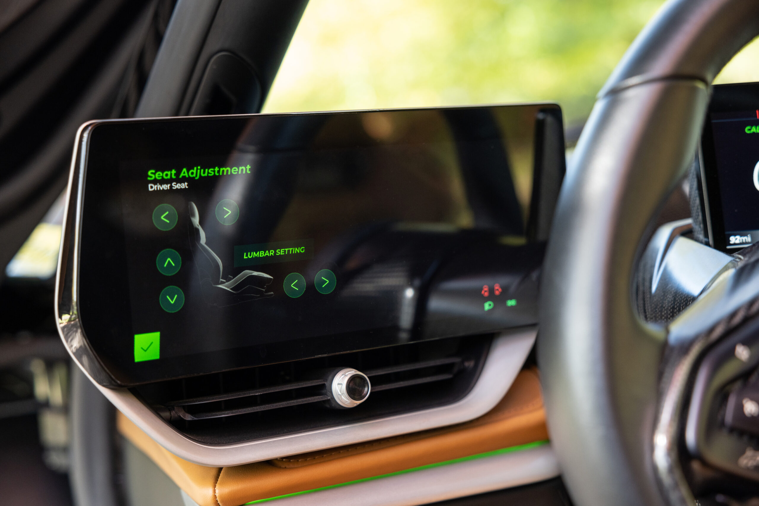 Inside, the Battista blends classically quilted leather and brushed aluminum with exposed carbon fiber and a tri-screen setup. The left-hand touchscreen features controls for the drive modes and seating position, the right-hand touchscreen carries out navigation and other infotainment functions, and a central screen—which looks like an upright, propped smartphone—displays stuff like vehicle speed. The screens are oriented toward the driver, a nice touch, but seeing as seat positioning is controlled via the left screen, it means the passenger has to request that the driver activate their seat controls, which then show up on the right-hand screen and can be controlled there.