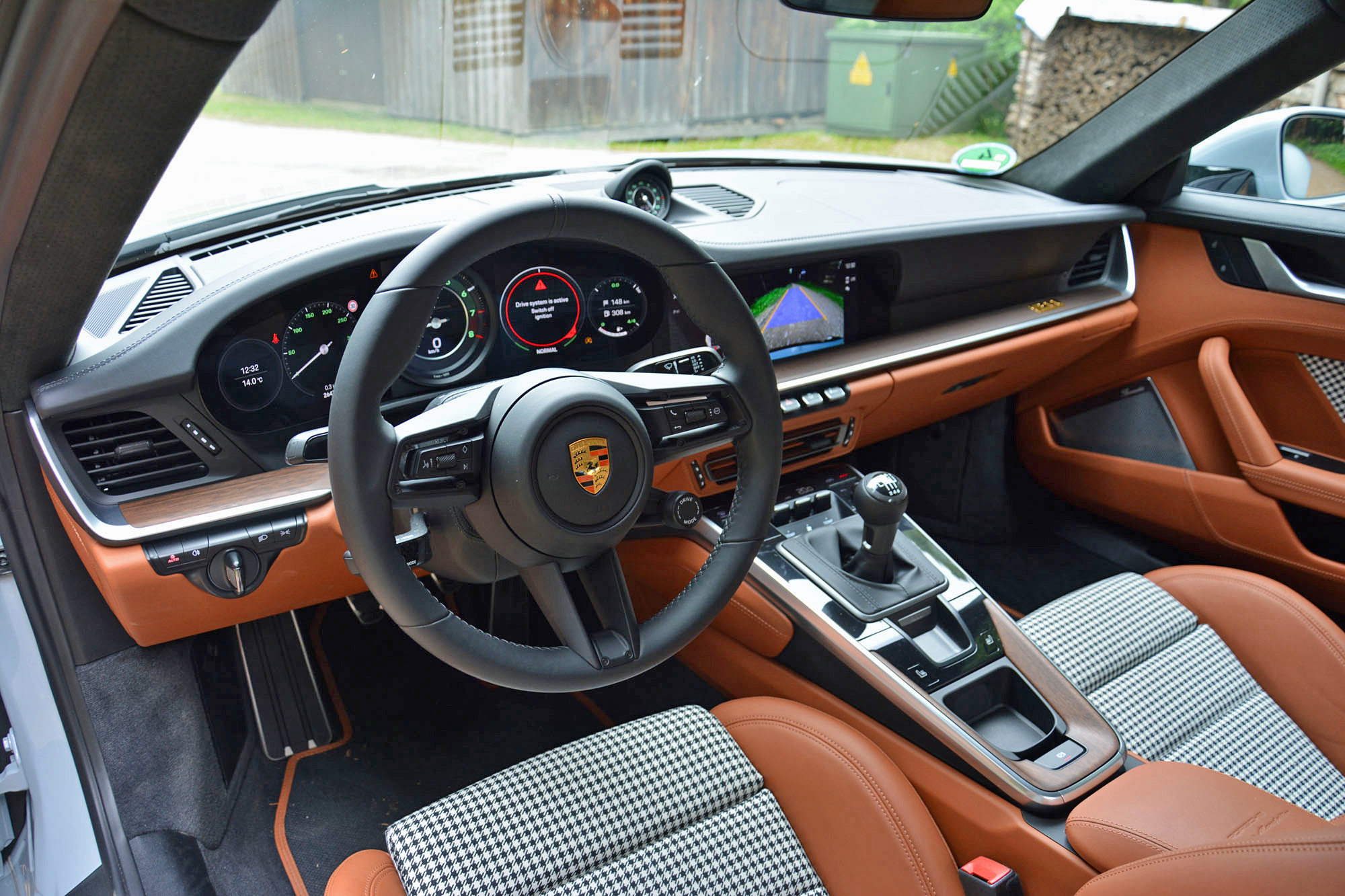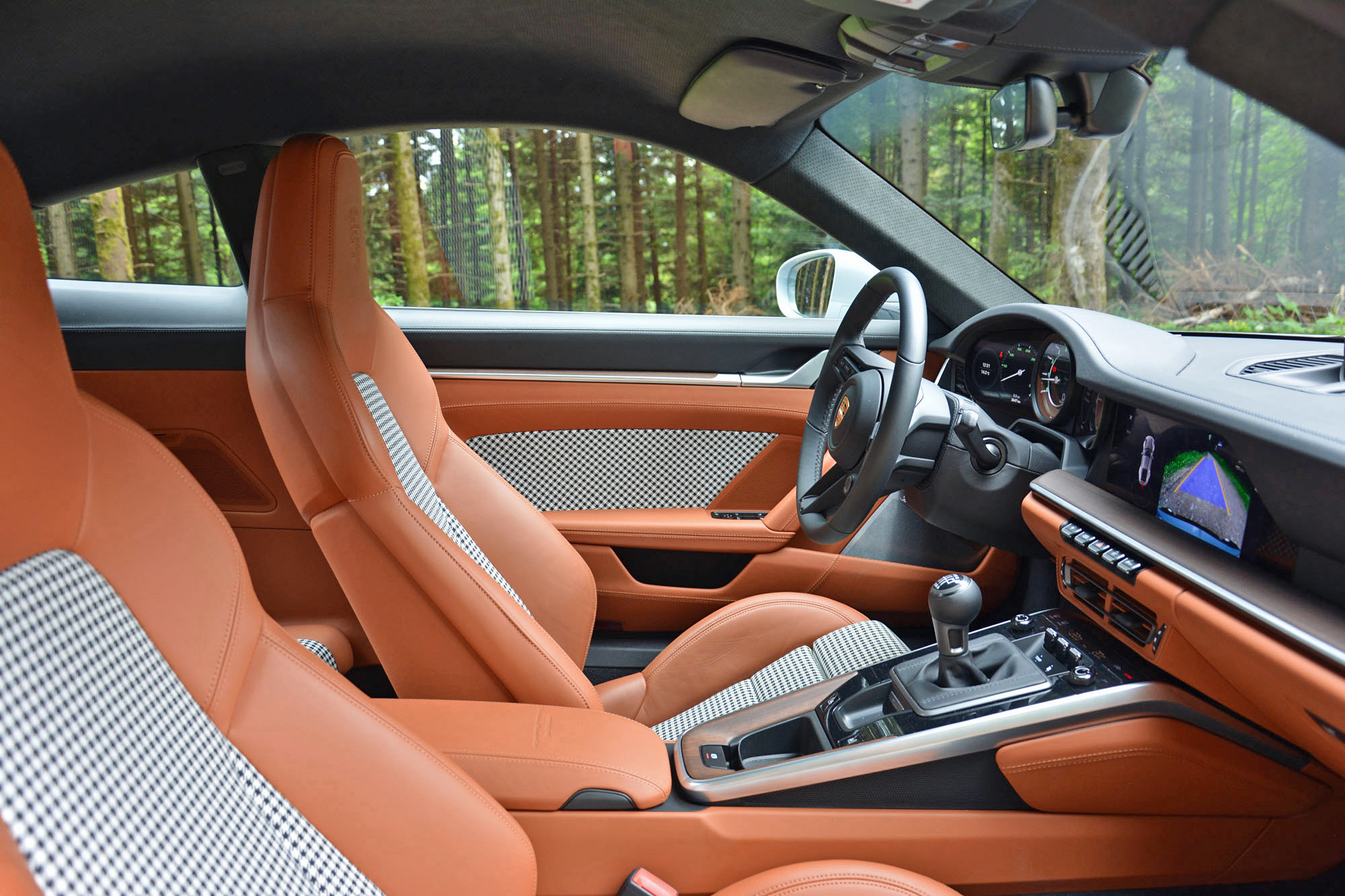 Inside, the Sport Classic treatment brings gorgeous houndstooth (or “Pepita” in Porsche-speak) inserts in the seats and door panels, plus leather upholstery offered in either black or Classic Cognac. There’s also a numbered “911 Sport Classic” badge on the right side of the dashboard to remind passengers of what they’re in. The rest is mostly standard 911 fare, so the driver faces an analog tachometer flanked by a pair of seven-inch thin-film transistor (TFT) screens and the middle part of the dashboard is dominated by a touchscreen for the infotainment system, which features an intuitive interface and clear graphics.