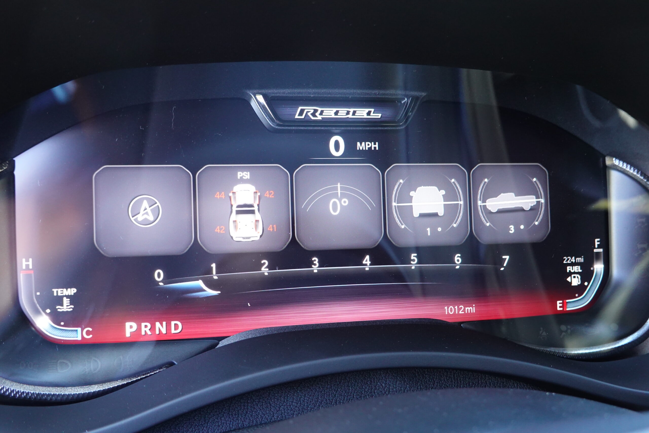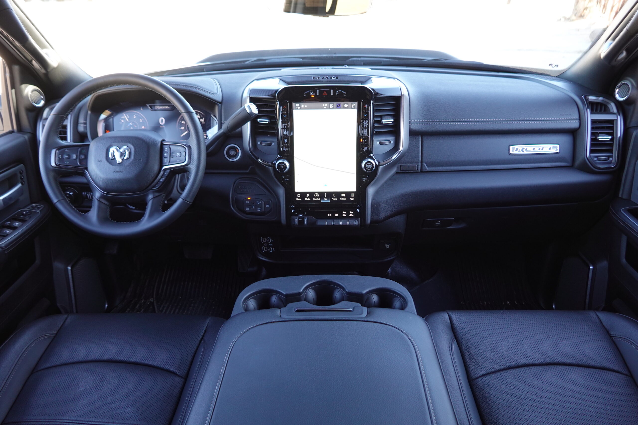 But the option many folks will choose is the Cummins diesel, here made distinct from its gasoline-powered sibling with a Cummins turbo diesel front fender badge. I was hoping that a truck named “Rebel” would have the High Output version of the Cummins diesel, rated at 1,075 lb-ft of torque. Nope. Ram is offering the normal rating for the 6.7-liter straight six, delivering 370 hp and 850 lb-ft of torque down at 1,700 rpm. Still good numbers to be sure, but a bit behind the competition. When equipped with the Cummins, the Rebel is rated to tow 14,920 pounds.