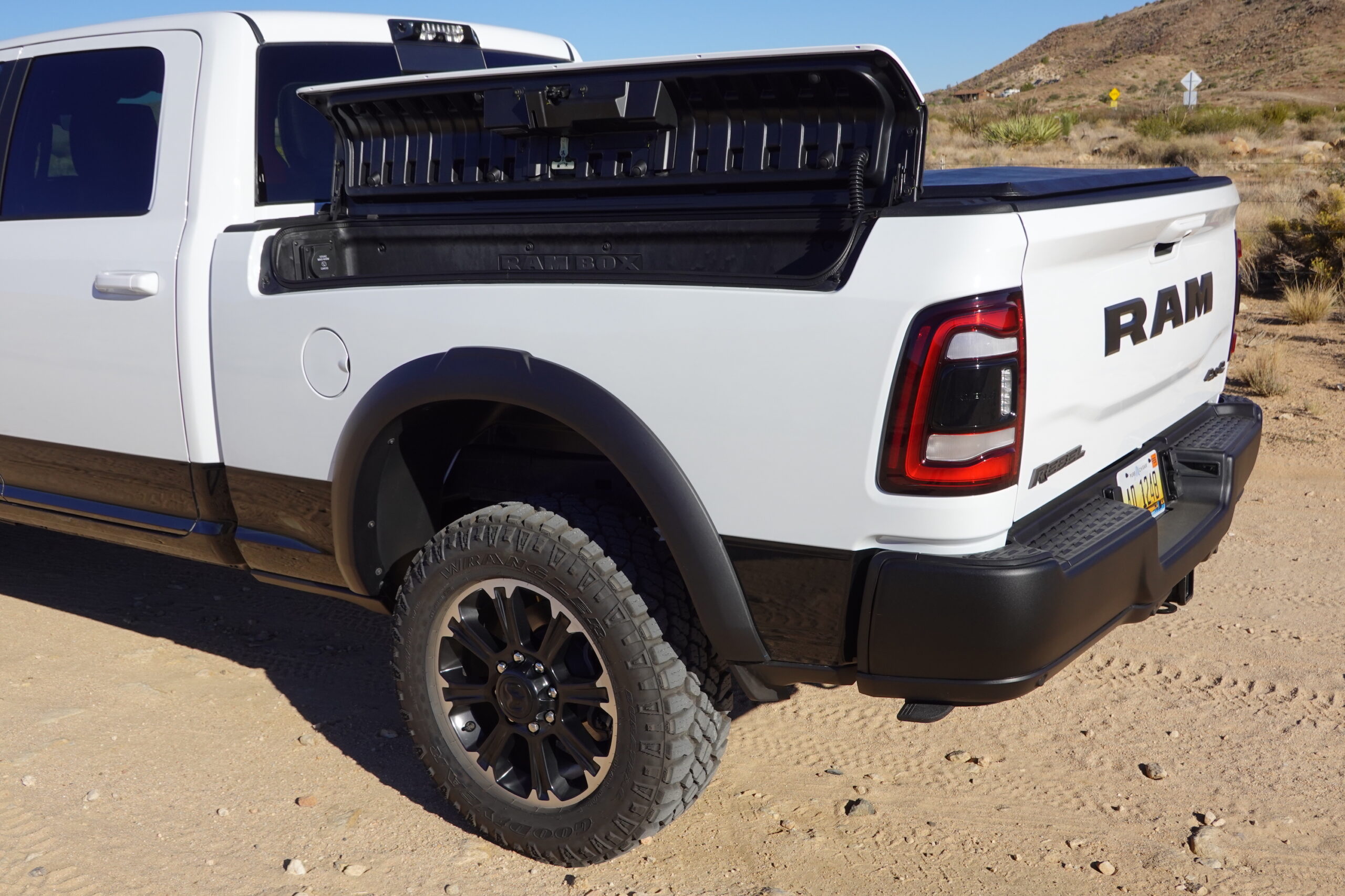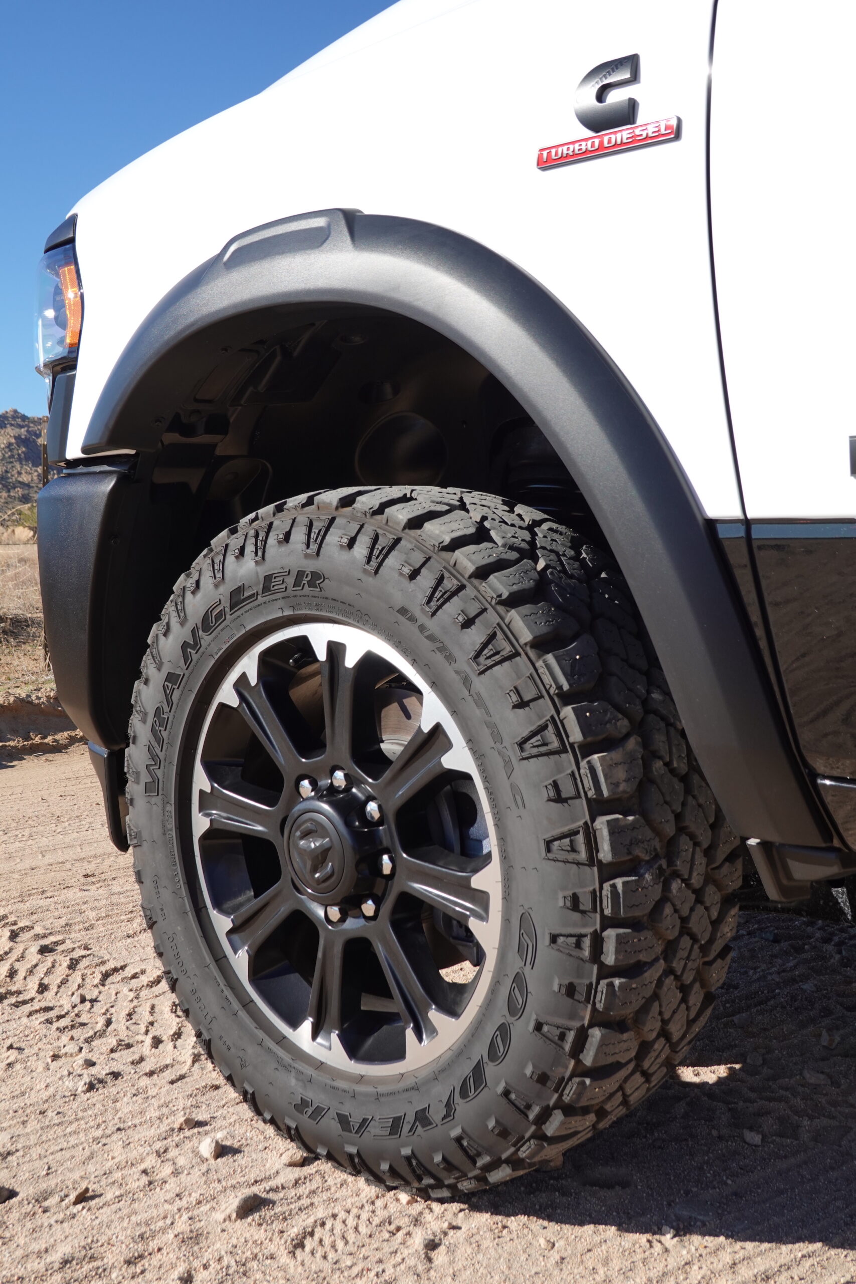 However, to boost traction, the rear differential has the functionality to act as both a limited slip and fully electronic locker at the push of a button. Unlike the Power Wagon, the Rebel has an open front differential instead of an electronic locker. The Rebel sits tall on 285/60R20 (33-inch) tires that are similar to the Power Wagon in terms of tread pattern but carry a heavier Load Range E rating. The Power Wagon also uses 17-inch wheels instead of the 20-inch wheels on the Rebel. Larger wheels mean a lower tire profile so there’s less tire sidewall cushioning in rough terrain. On the flip side, that lower profile should improve handling and towing stability. In terms of protection, the Rebel offers skid plating for the fuel tank and transfer case.