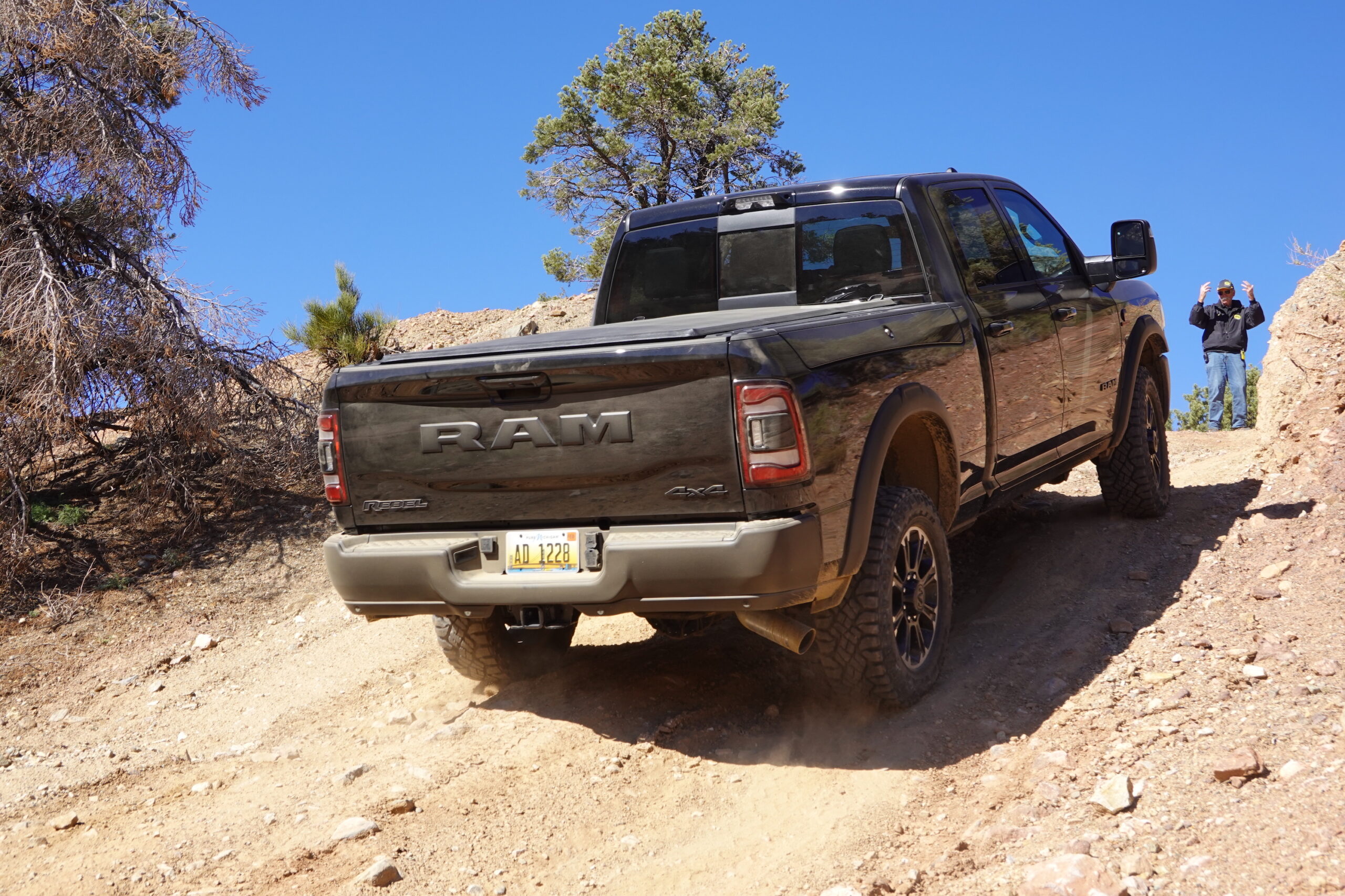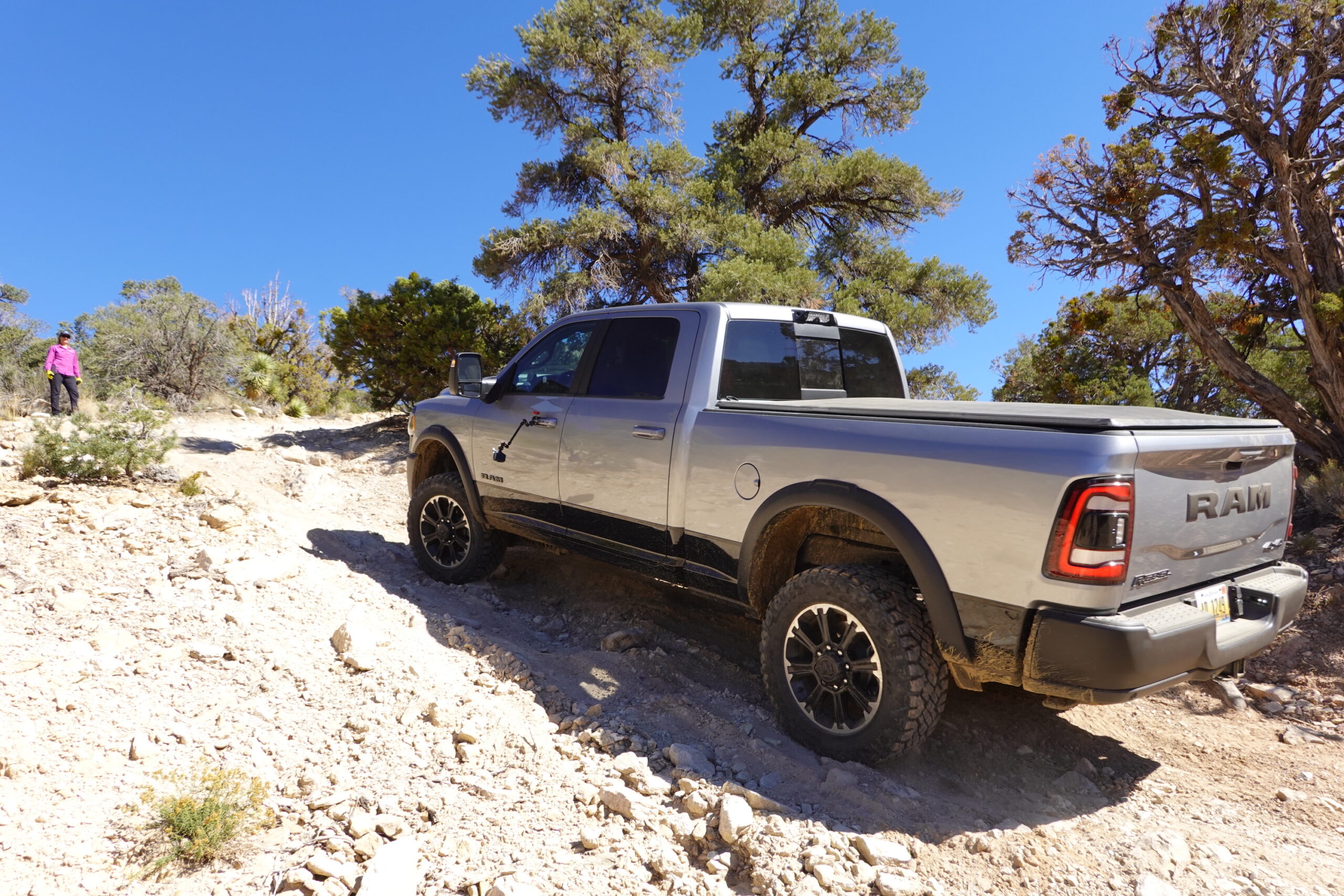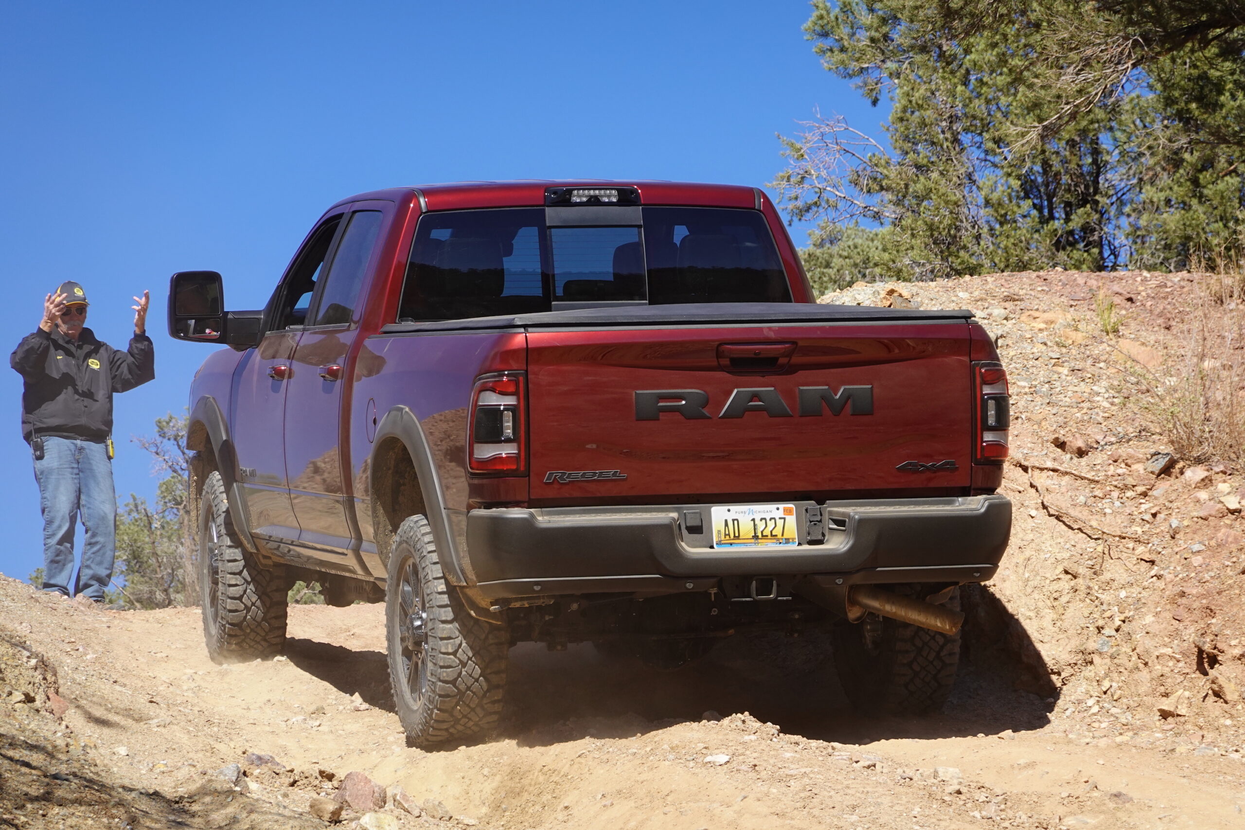At Ram’s fun off-road playground—a short and steep off-camber trail—the Rebel took every obstacle in stride. The torque-rich diesel made easy work of the climbs. However, the throttle is so sensitive on the diesel I often found myself asking for more torque than I wanted. I’d prefer a more relaxed throttle setting for low-range four-wheeling. Still, the Rebel rarely slipped a tire on this trail thanks to the electronic rear locker. On the way down, though, the Rebel’s stiff suspension didn’t flex too well. So the right rear tire spent some time airborne instead of gripping the trail. Later, I swapped into a gas truck and hit the playground trail again. The 6.4-liter’s throttle was easier to manage and overall it did feel like less weight on the nose, and that made it feel a little more balanced.