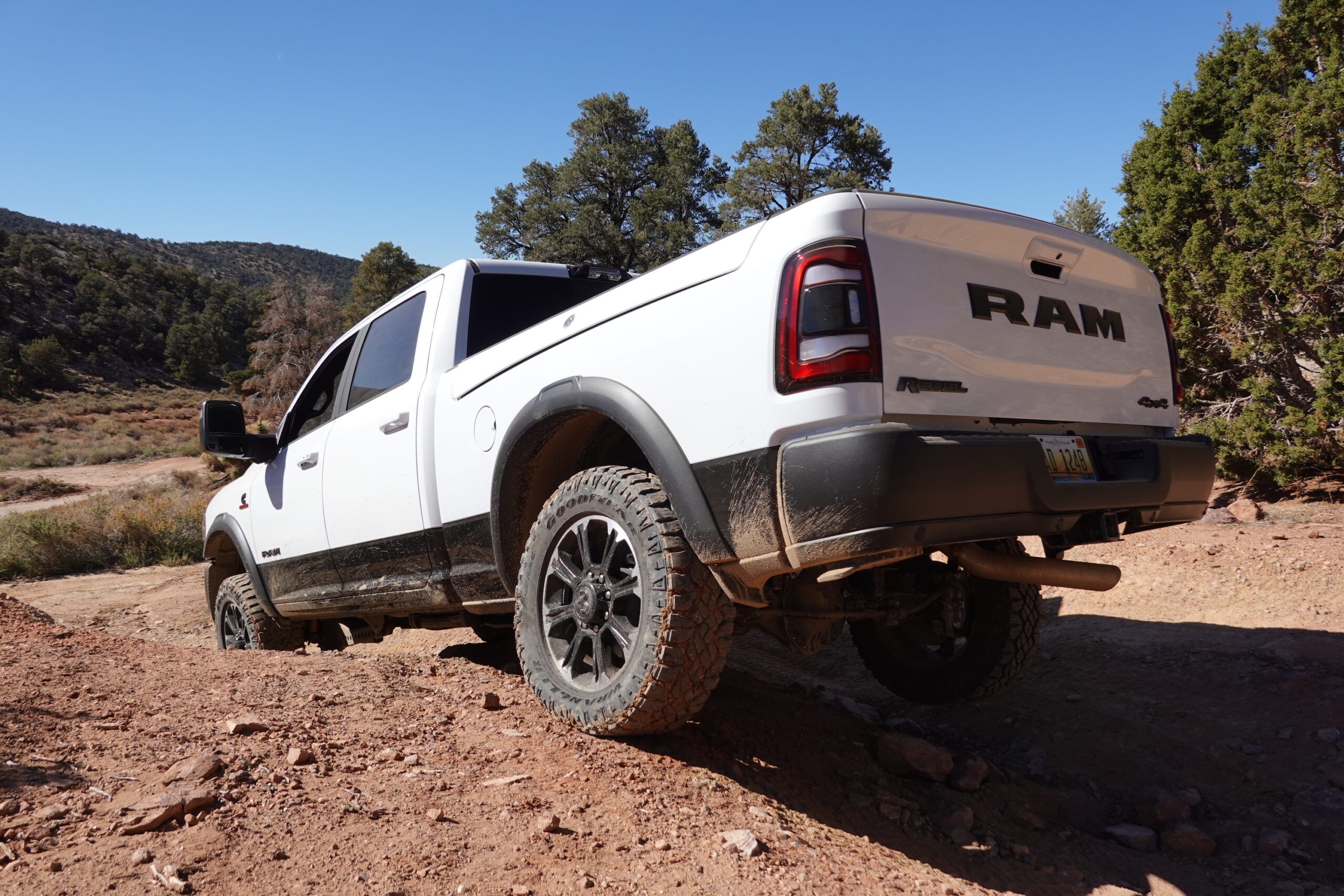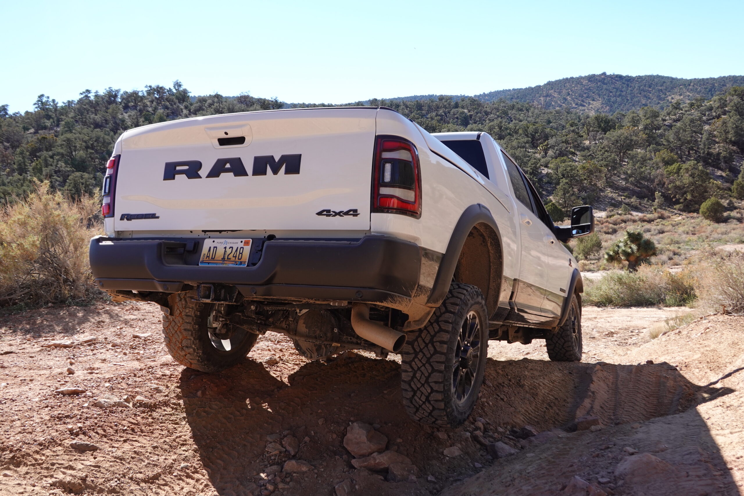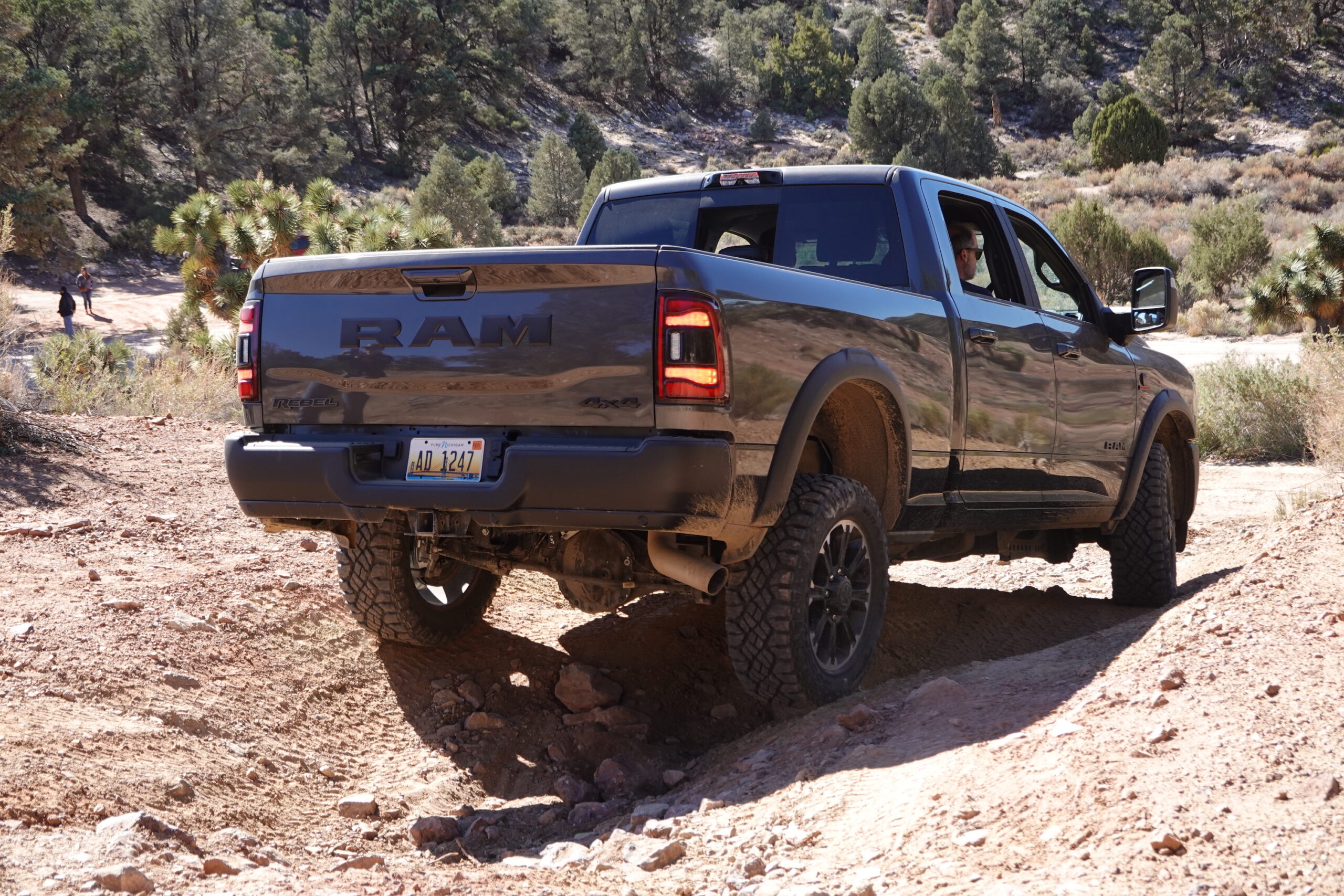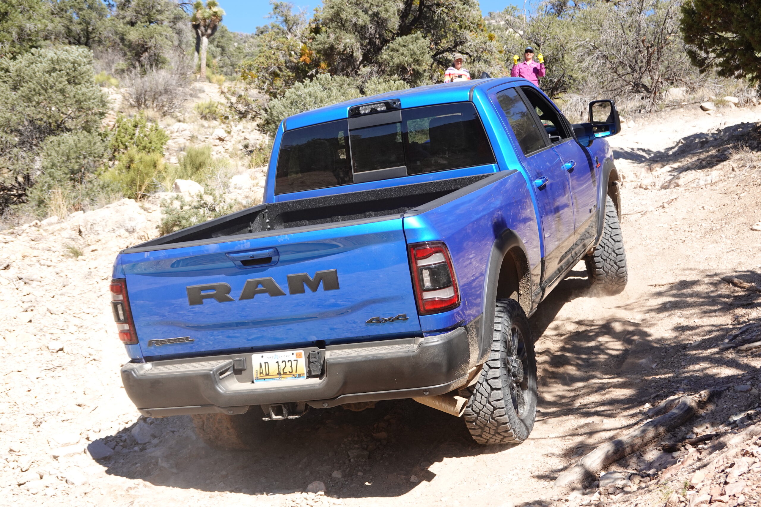 At Ram’s fun off-road playground—a short and steep off-camber trail—the Rebel took every obstacle in stride. The torque-rich diesel made easy work of the climbs. However, the throttle is so sensitive on the diesel I often found myself asking for more torque than I wanted. I’d prefer a more relaxed throttle setting for low-range four-wheeling. Still, the Rebel rarely slipped a tire on this trail thanks to the electronic rear locker. On the way down, though, the Rebel’s stiff suspension didn’t flex too well. So the right rear tire spent some time airborne instead of gripping the trail. Later, I swapped into a gas truck and hit the playground trail again. The 6.4-liter’s throttle was easier to manage and overall it did feel like less weight on the nose, and that made it feel a little more balanced.