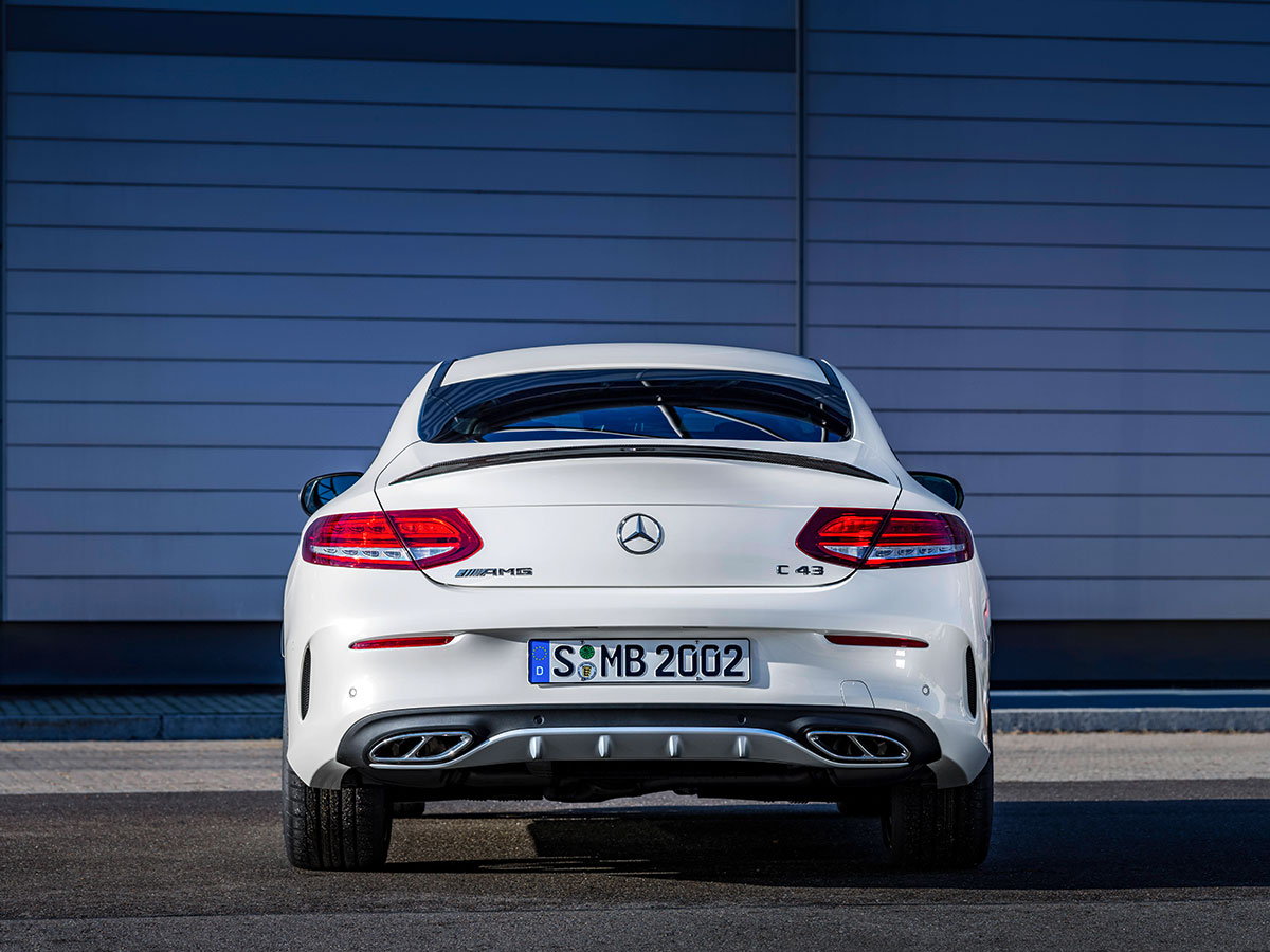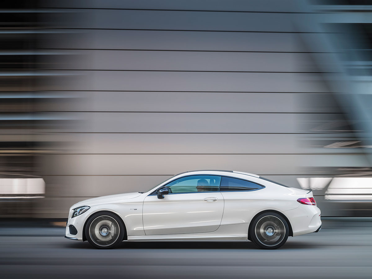 Like the Mercedes-AMG C43 sedan (which, confusingly, is currently called the C450 AMG) the C43 coupe gets its pep from a twin-turbocharged 3.0-liter V6 tuned to crank out 362 horsepower and 384 lb.-ft. of torque. (The name is strictly nostalgia for the AMG version of the W202 C-Class, which actually was powered by a 4.3-liter V8.) Using the traditional definition of “one man, one engine,” this mass-produced motor isn’t technically an AMG mill. Still, while not as special as the engine beneath the hood of the big-bore 63s, according to Mercedes it’s still strong enough to kick the C43 coupe from 0–60 in 4.6 seconds—a full 1.5 seconds faster than the old C43, which did feature a hand-made motor.