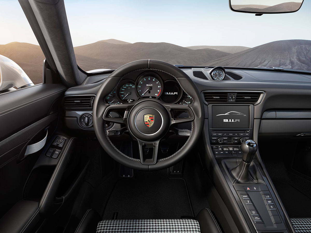 Oh, and there’s houndstooth, too. The 911 R’s buckets are upholstered in the good stuff, classic fabric. The 14.1-inch steering wheel and the manual shifter are both unique. The interior trim is carbon fiber, and an aluminum plaque commemorates the limited-run nature of the car. And, as is Porsche GT tradition, the door handles have been ditched in favor of fabric loops.