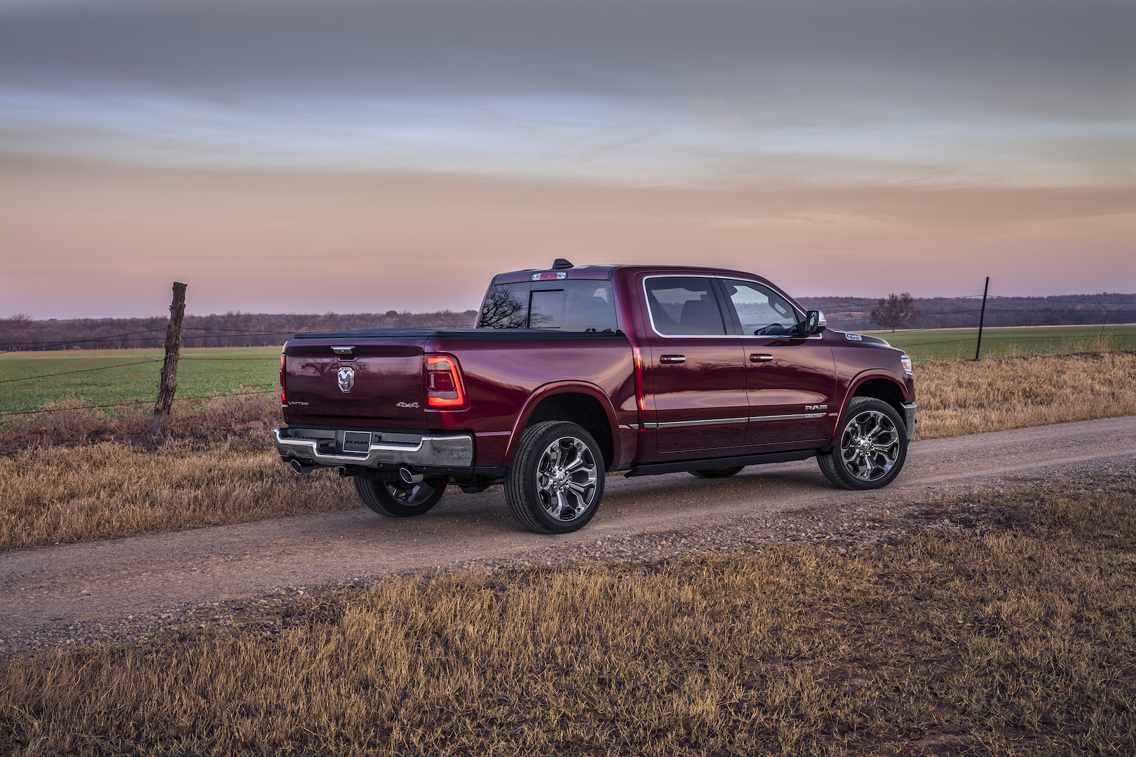 Max payload capacity rises to 2,300 pounds, with max towing of 12,750 pounds. Front and rear axles get six-lug connectors, up from five, and the rear differential is bathed in engine coolant for a fast rise to operating temperature and to cool the diff under heavy loads. Reworked active grille shutters reduce drag for better fuel economy, and coil-spring models—versus those with the optional four-corner air suspension—get a deployable front air dam to do the same. Opt for that plush air ride setup—which no other half-ton truck offers—and the Ram hunkers down automatically to slice through the wind at speed. Fuel economy rises to an official 15/21 mpg in city and highway for the 4×4, 5.7-liter Hemi-powered V8 truck.