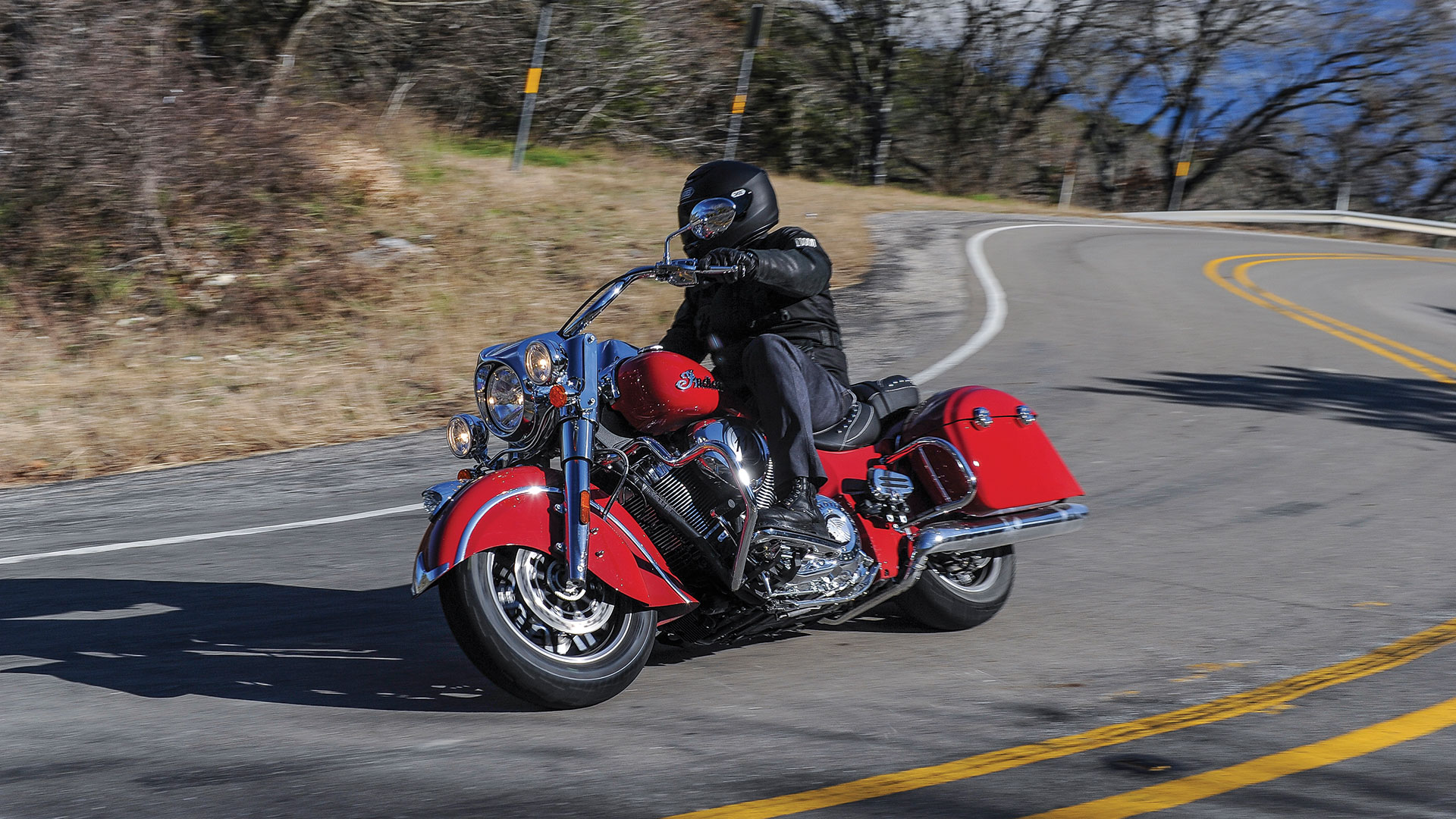 Contrary to appearances, the Springfield isn’t just a Chief Vintage fitted with hard bags. Rather, the new 2016 Indian Springfield employs the company’s touring steering head, not the cruiser head, which means it has a slightly steeper fork angle that will translate to quicker response and greater agility. What’s more, steering effort compared to that of the Chieftain and Roadmaster should be reduced because the Springfield isn’t saddled with the full fairing of those models, which reportedly weighs nearly 25 pounds (thanks in part to its power-adjustable windscreen).