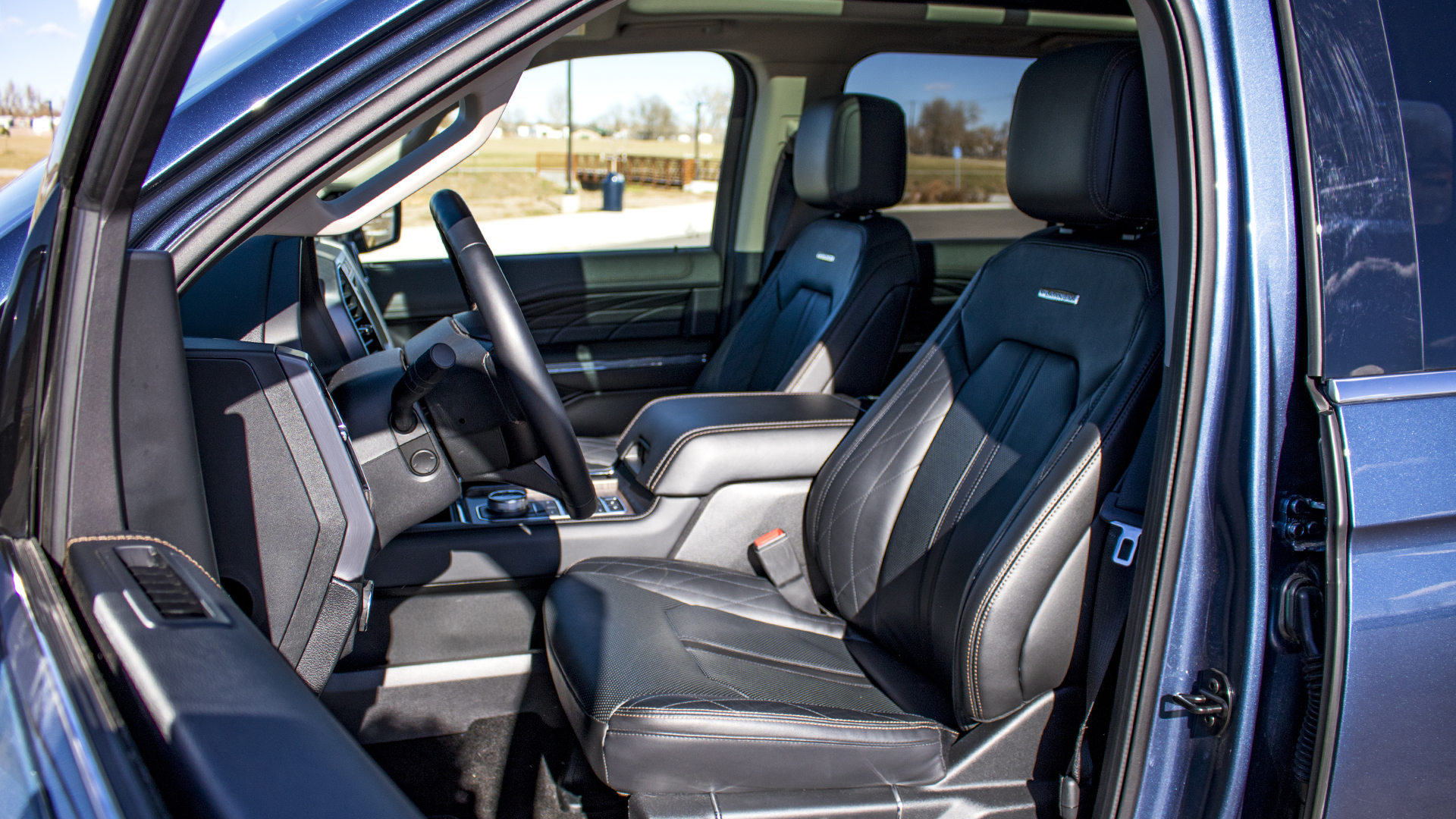 - Step inside the Platinum edition—mind the power-retractable running boards—and you’ll find a cavernous, leather-lined space enhanced by a panoramic sunroof. It has the larger-than-life feel you expect in a truck like this, with flip-forward captain’s chairs in the second row, an eminently usable third row (losing the solid rear axle allows for a lower cabin floor), and a ton of tech, like massaging front seats, a 10-device-capable wi-fi hotspot, and a premium Bang & Olufsen sound system. Many of the goodies are options, which does leave the pricing strategy a little…ambitious. But in terms of comfort and function, especially for those with large broods of brooding kids, there isn’t much to complain about in the Ford Expedition. It’s simply an easy, friendly space, one I didn’t feel bad turning into a carpeted cargo hold when I stuffed a giant couch in there.