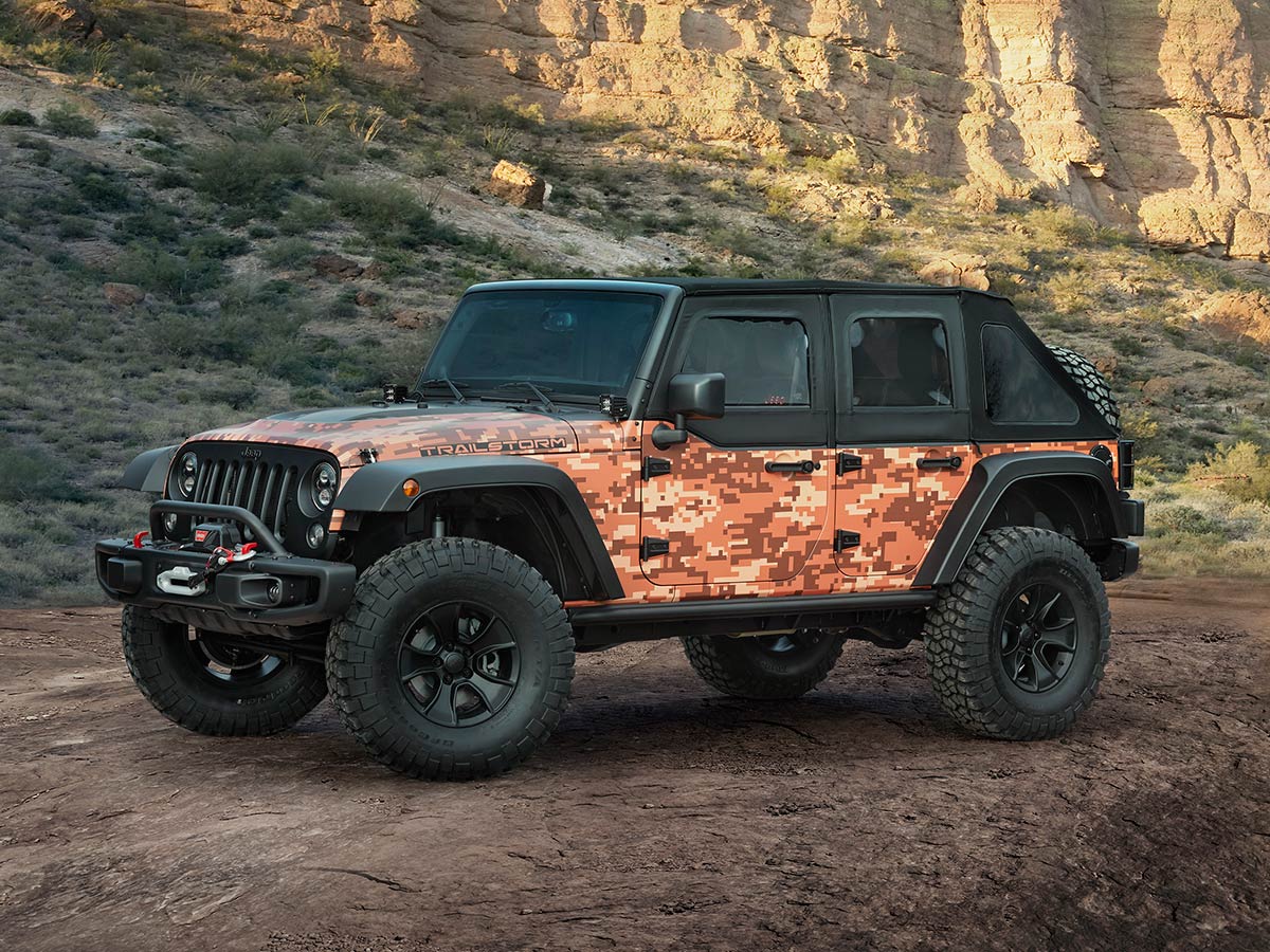 The Trailstorm’s fastback soft top gives it a sexier profile than the Wrangler Unlimited on which it’s based; the 37-inch off-road tires, Fox shocks, half doors and winch all make off-roading even easier. Add LED fog lamps, an aftermarket tire carrier, steel bumpers front and rear, and high-top fenders, and you’ve got an appropriately tough-looking truck, too. And yet, let’s not lie: Nobody’s looking past the black-and-desert camo exterior treatment to appreciate any of it.