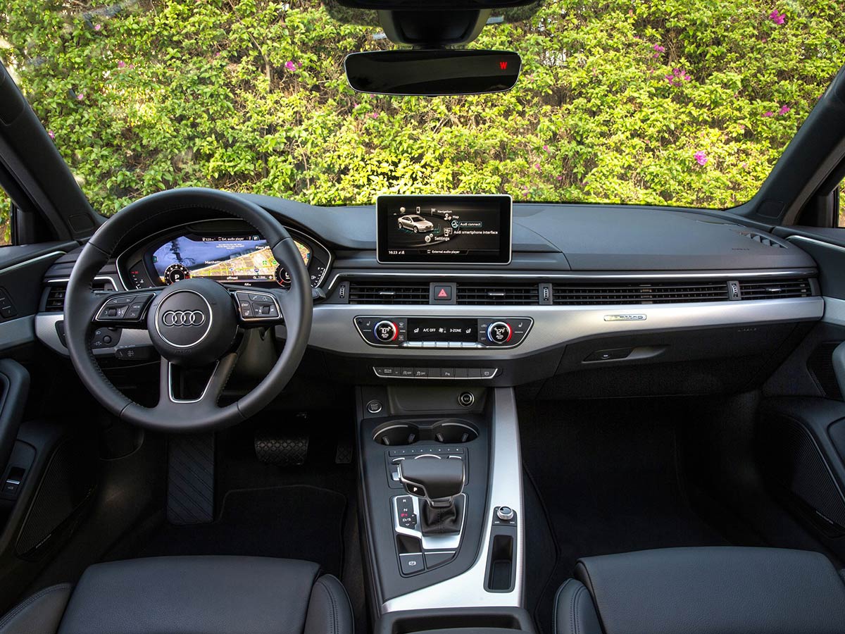 A slim wafer of horizontal dashboard houses the A4’s latest design innovation: Brush fingers on fine-metal analog climate switches to summon their digital menus. (The latest Camaro has already nabbed clever temperature readouts integrated into climate knobs). The A4 can halt for vehicles or pedestrians, mirror traffic and steer semi-autonomously; though it can’t change lanes at the flick of a turn signal like a Tesla or new Mercedes E-Class. But the Audi will warn occupants against opening a door and creaming a looming cyclist or pedestrian, flashing a strobe of light in any of four doors. Attempt a precipitous left turn into oncoming traffic at slow speeds, and the Audi applies a jolt of brake to avoid getting T-boned.
