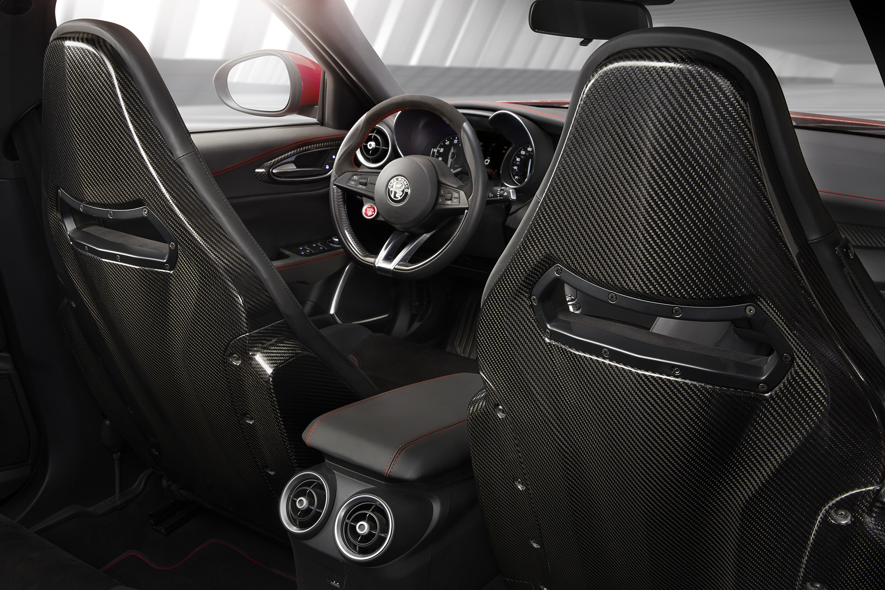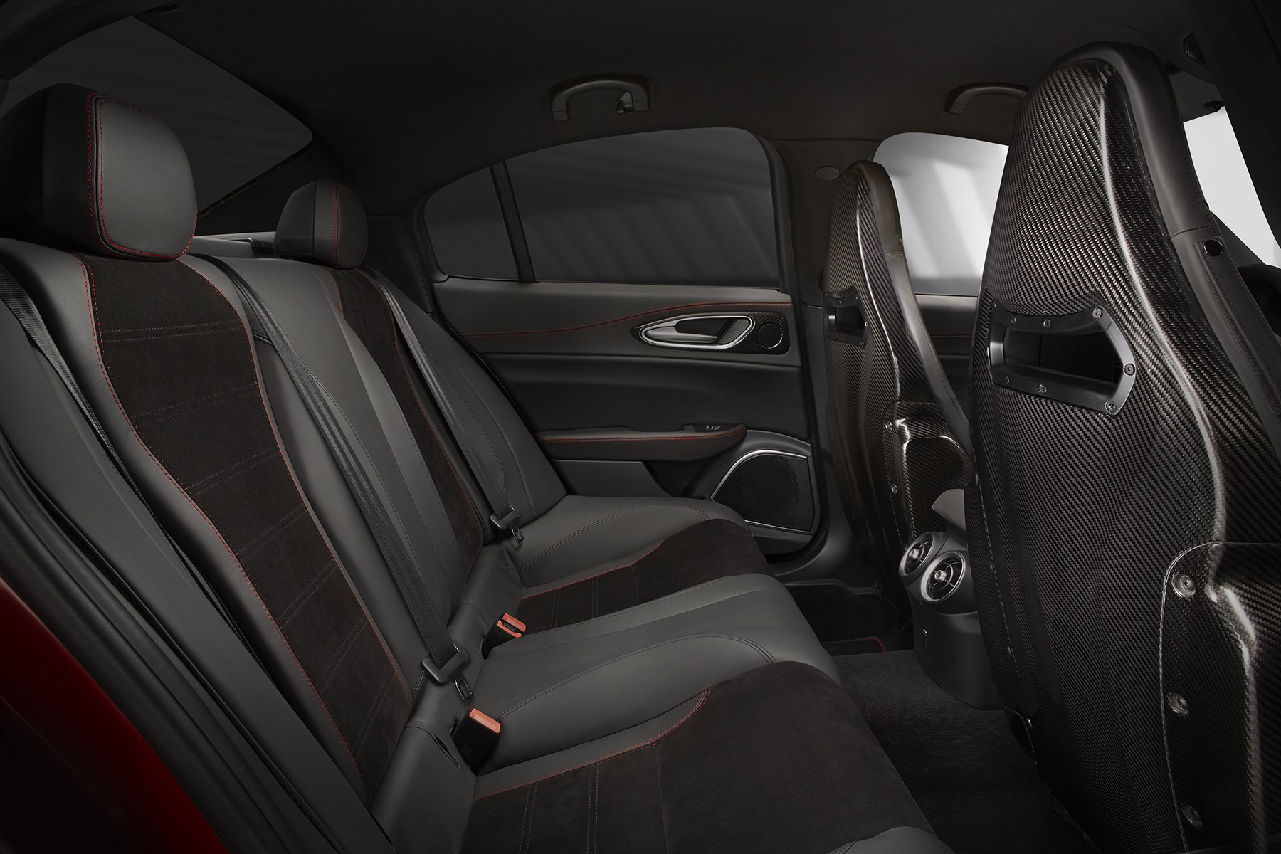 Unfortunately, the interior can’t quite cash the premium checks being written by the rest of the car. It’s a bit of a mishmash in there, as if the designers tried their hardest to give it a distinct, luxurious Italian flair while grabbing what they could from the Fiat-Chrysler parts bin and cutting a few noteworthy corners. The swooping dash is a gorgeous touch; too bad what appears to be a unique trapezoidal infotainment bezel reveals a dinky postcard-sized screen floating in a sea of black plastic when activated. Actually, there’s too much plastic, period—especially considering the $89,595 sticker on my tester.