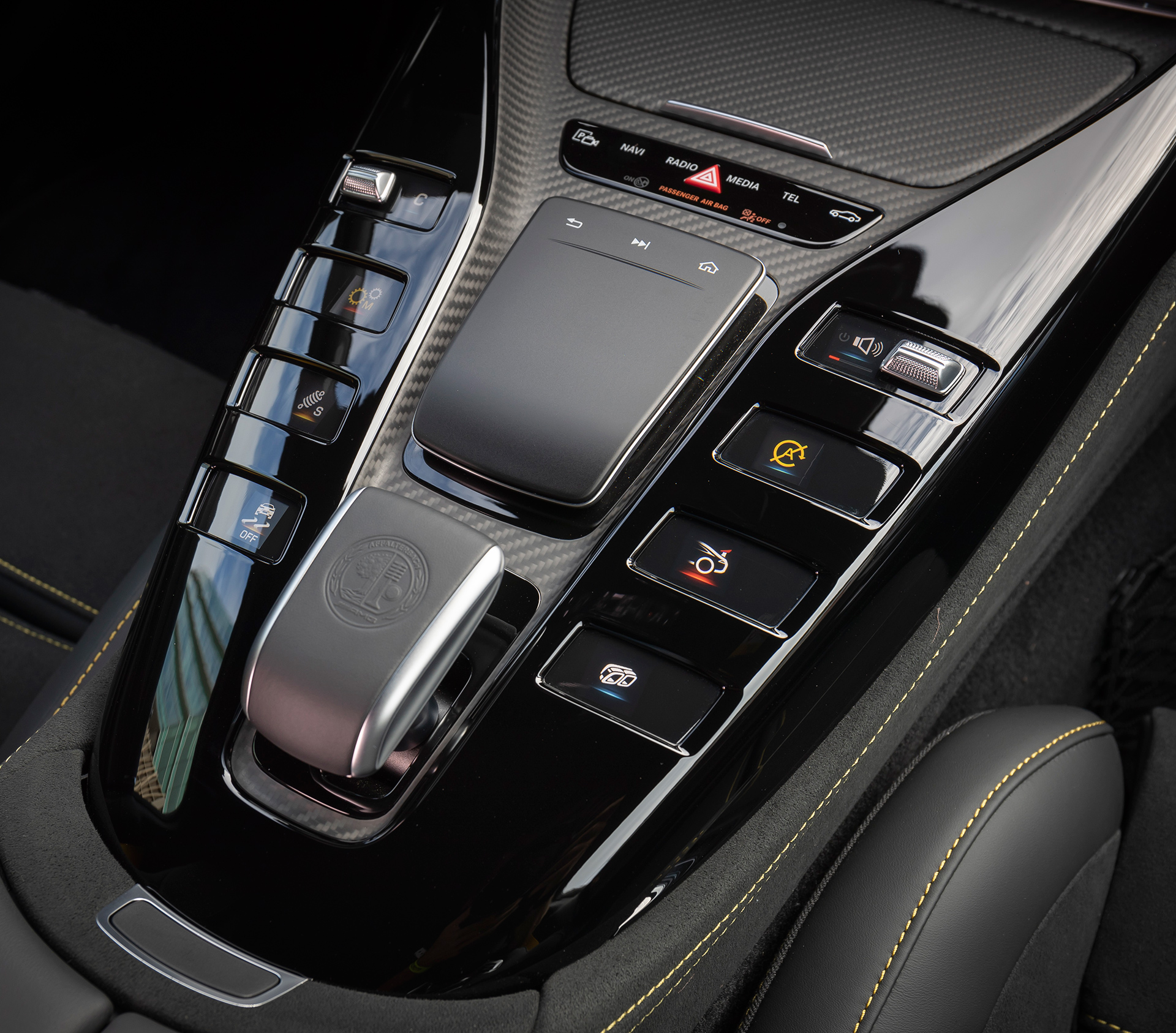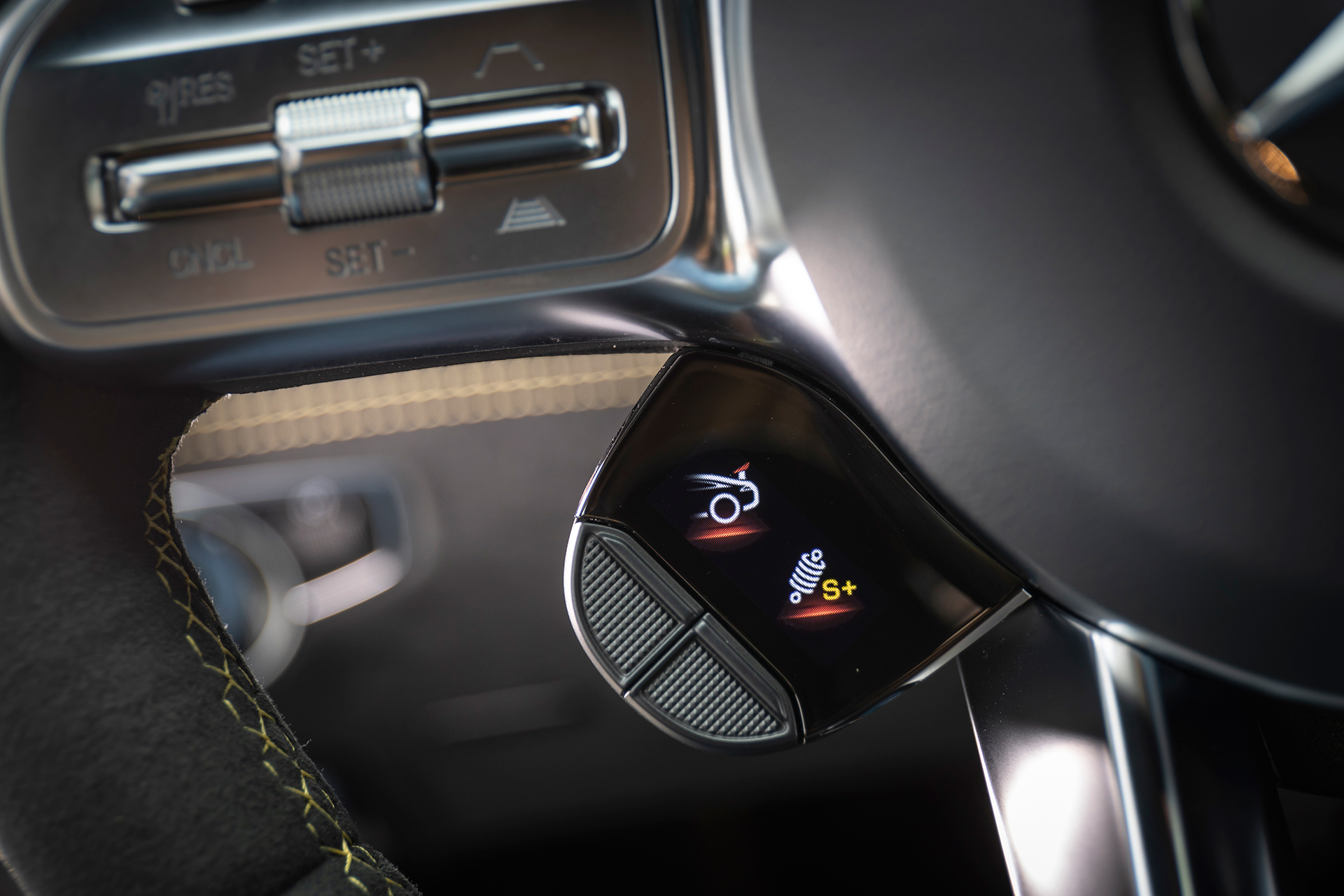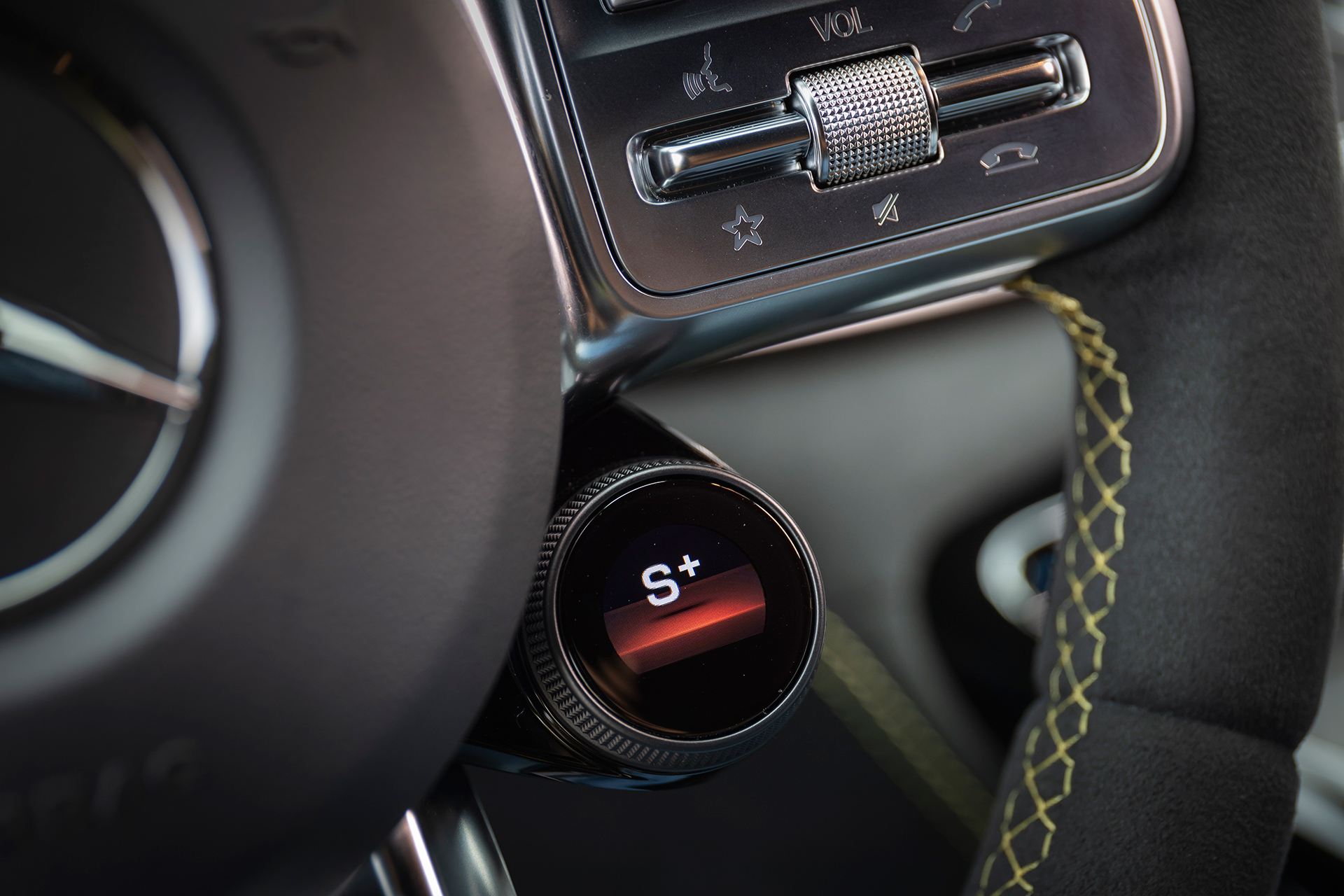 Luckily, the redundant performance controls on the steering wheel both look better and are far more convenient to use, with tabs for the ESP and performance exhaust settings on the left, and a Porsche Sport Chrono-like click wheel with a tiny enclosed screen on the right to flip between the drive modes. Between that and the many other steering wheel controls, you might almost never need to reach for the switches on that bulky console at all. (Good thing, too, because it’s a bit of an awkward reach.)