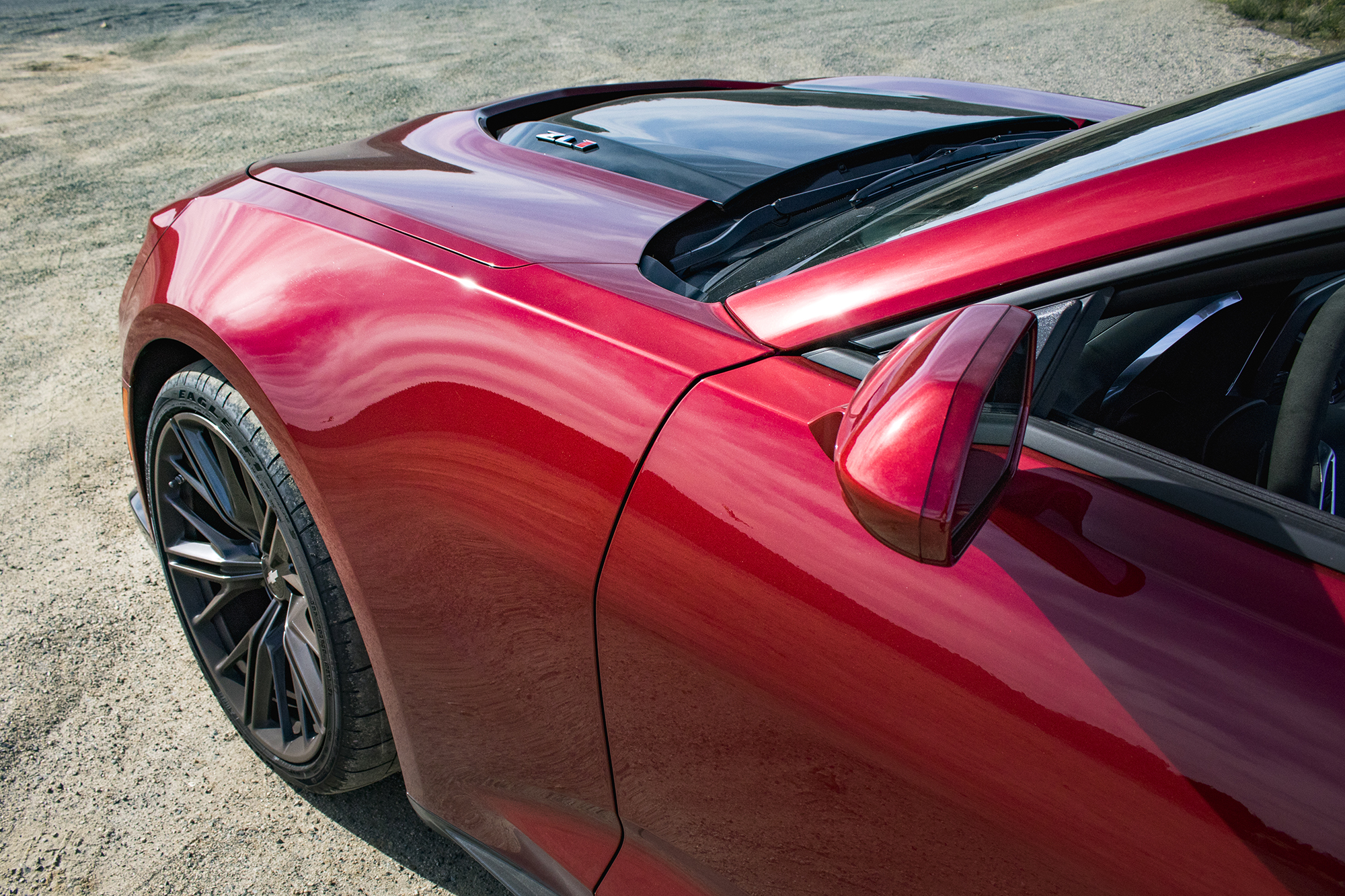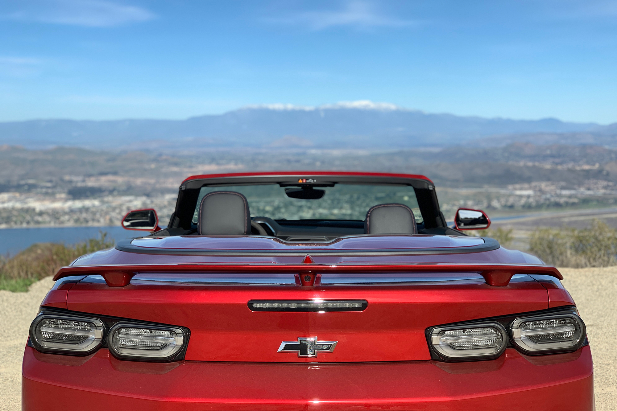 If you’re really looking to blend in, know that few things stand out in a traffic jam like a Garnet Red Chevy Camaro with a loping idle—and doubly so if you’re going topless. Weather permitting, that should be the ZL1’s default state—lowering the roof masks the high beltline and gives it a flat, almost retro profile. Raising all four windows does a pretty good job of insulating the cabin from swirling winds when you’re doing the speed limit. Push it above 80 with nothing but the great beyond above your head, though, and things get a little chaotic.