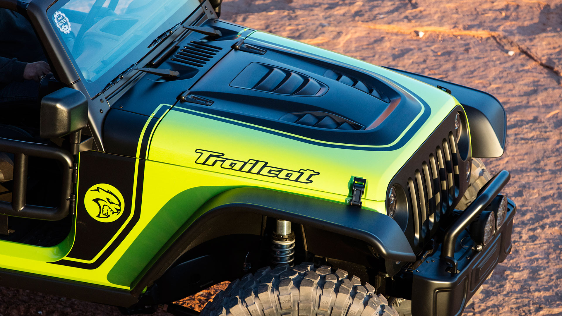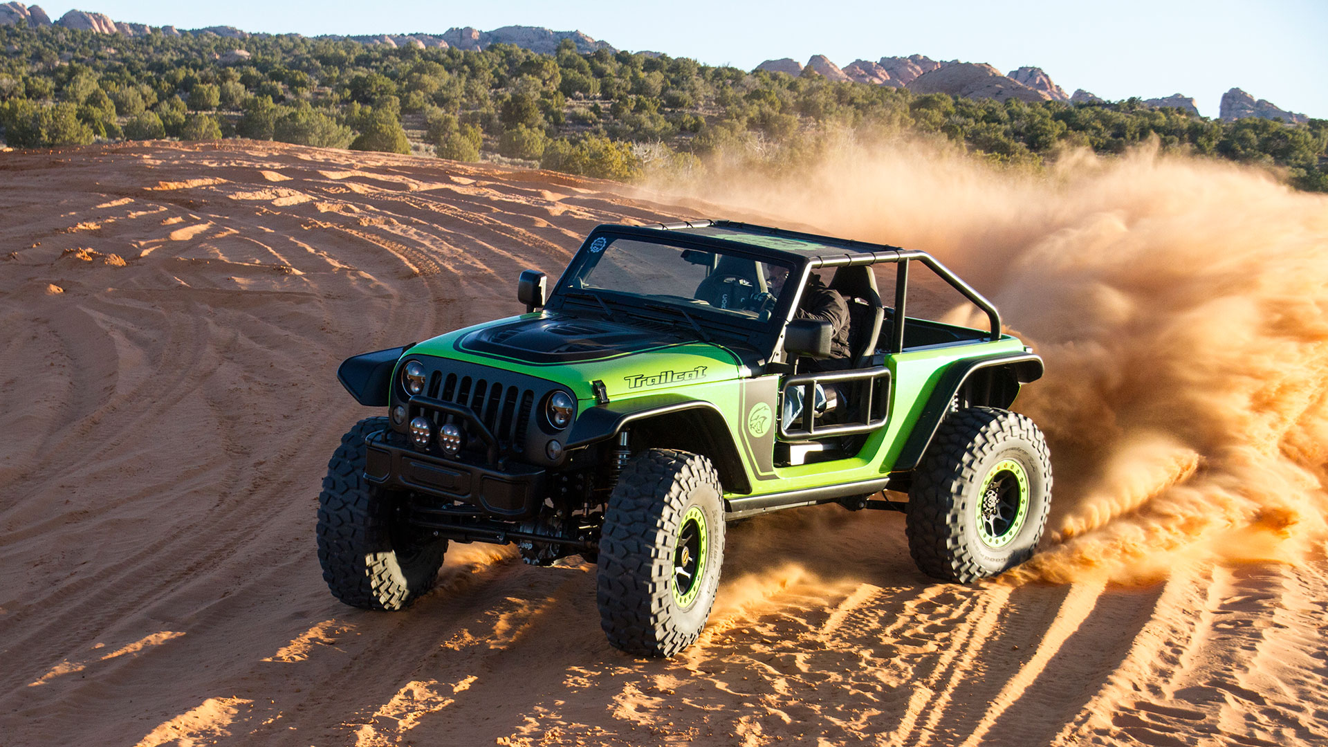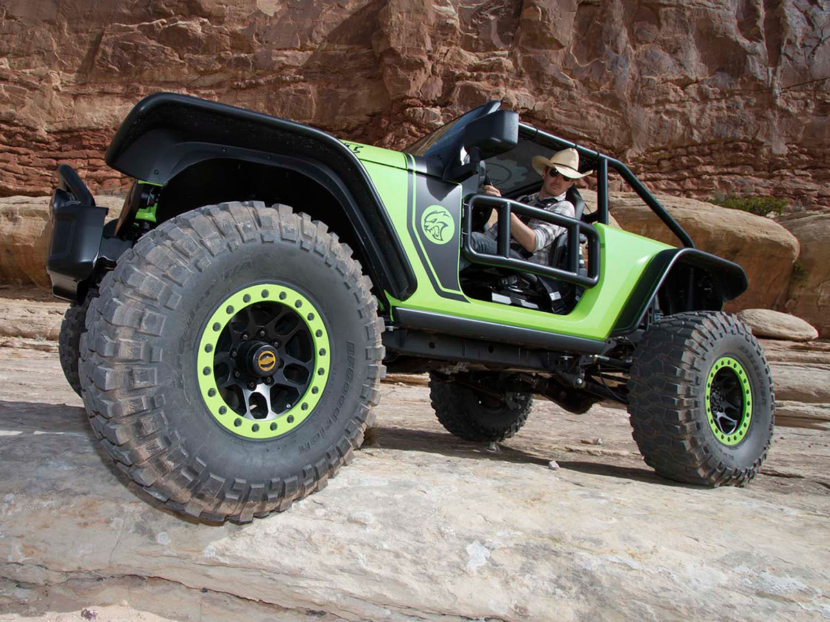 Out on the Utah slickrock, a photographer waits at a ledge. Just feet ahead, the Jeep’s invisible, hidden by a long, bright green hood that’s been bored and sculpted to accommodate and aspirate a massive 6.2-liter V8 and blower. Gentle feathering of the clutch puts those monster tires on the lip; gentle feathering of the brake lowers them over the edge. The rort and rumble alone sends pebbles airborne like dust. It takes leaning out over the tube-frame door to grasp the transition into space, meaty coil-overs make it feel like nothing. The photographer’s bold, getting so close.