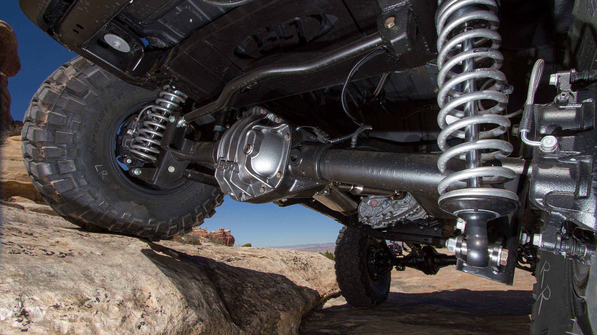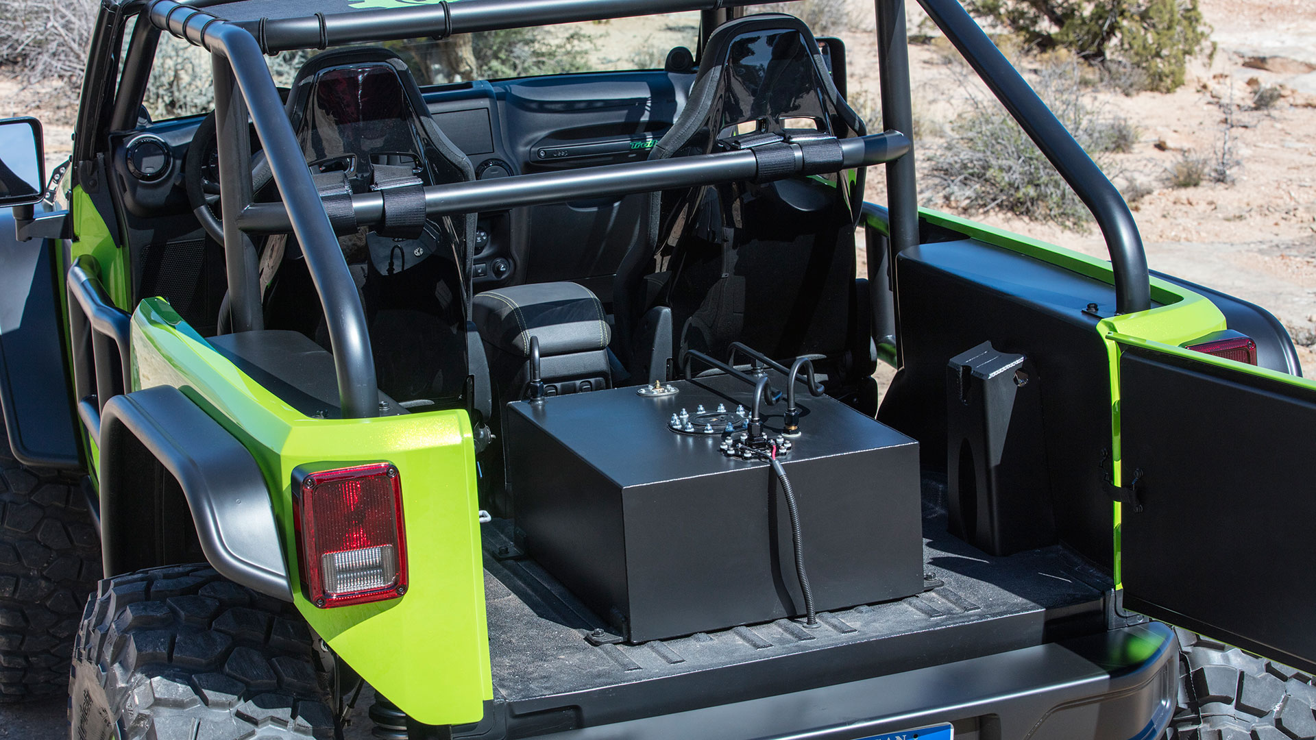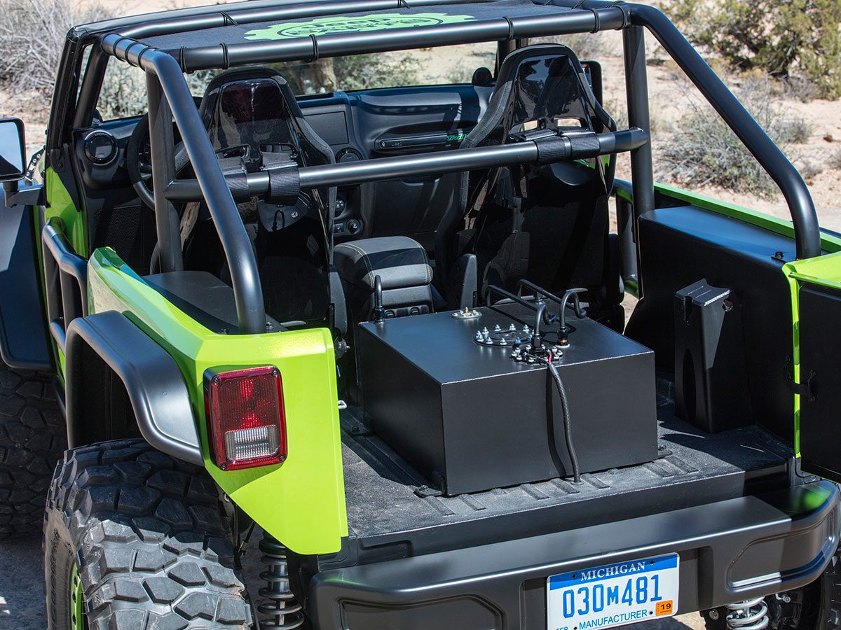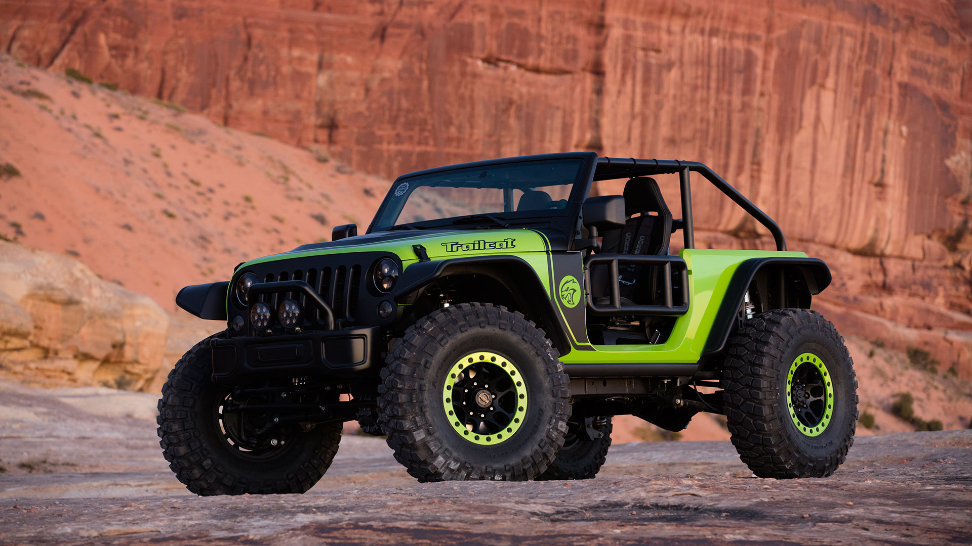 Out on the Utah slickrock, a photographer waits at a ledge. Just feet ahead, the Jeep’s invisible, hidden by a long, bright green hood that’s been bored and sculpted to accommodate and aspirate a massive 6.2-liter V8 and blower. Gentle feathering of the clutch puts those monster tires on the lip; gentle feathering of the brake lowers them over the edge. The rort and rumble alone sends pebbles airborne like dust. It takes leaning out over the tube-frame door to grasp the transition into space, meaty coil-overs make it feel like nothing. The photographer’s bold, getting so close.