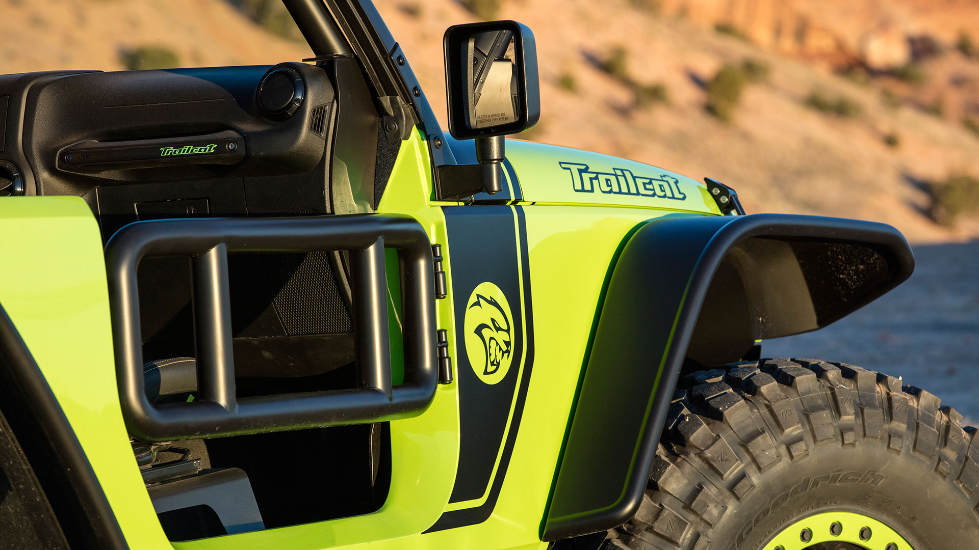 Before anything else, there’s a loud whine. The fuel pump. A mechanical insect’s whir that’s out of place in the stillness of Moab. And then ignition. Seven-hundred-something horsepower’s worth of combustion, supercharger whine, and lunatic wonder. A shouted expletive in this red rock cathedral, or maybe a reverberating hallelujah. The Jeep Trailcat speaks our language.