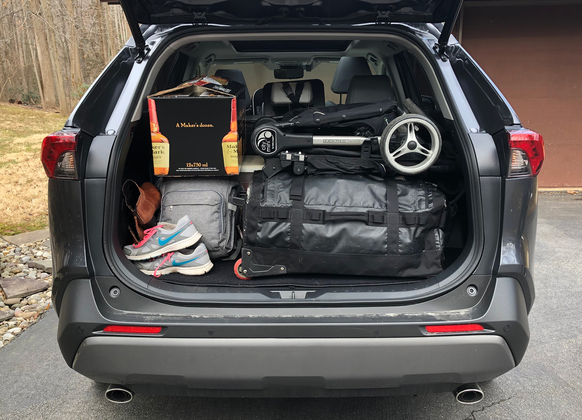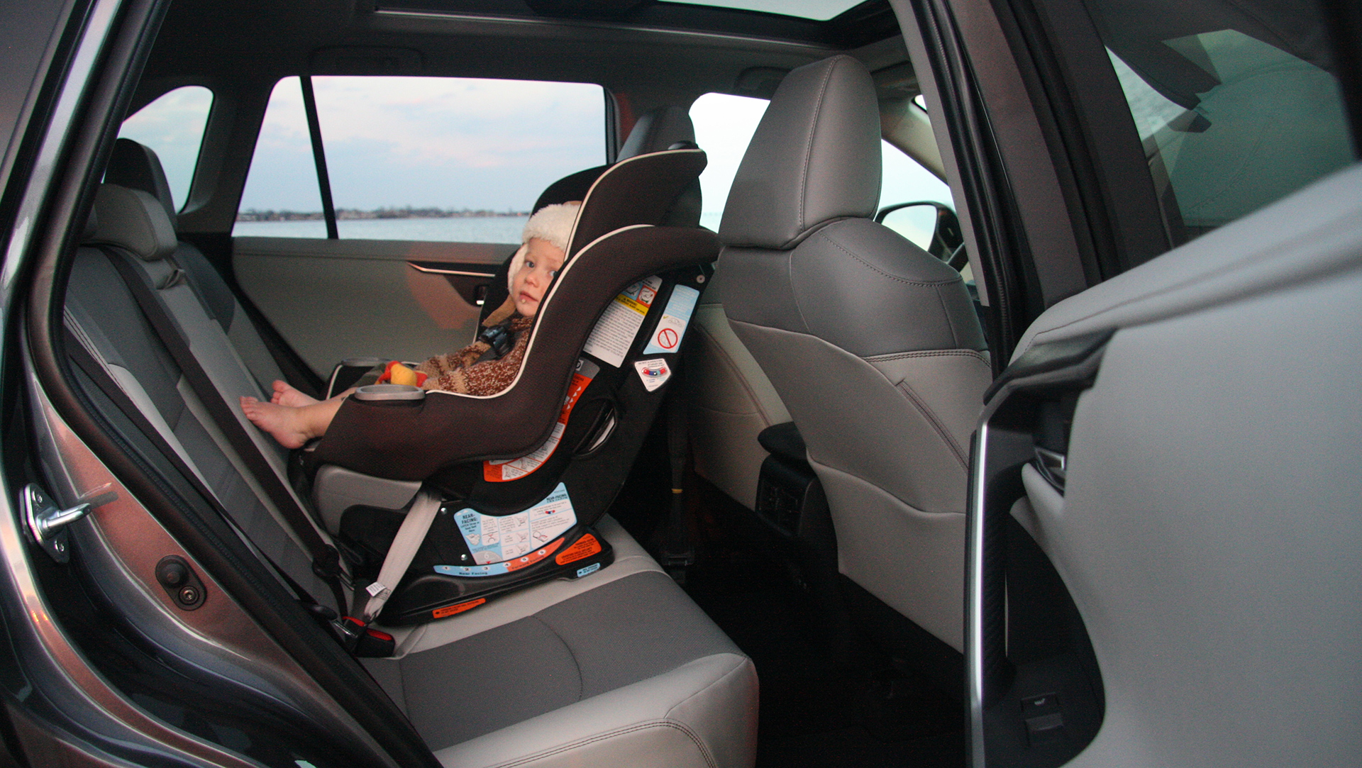 The seats are comfortable and there’s plenty of leg, hip, and shoulder room alike. With its height, the RAV4 also has plenty of headroom, too. My kid enjoyed gazing out the panoramic roof glass—a novelty since most states decided to face very young passengers rearward, with a view only of opaque seat cloth/leather for the first several years of their lives.