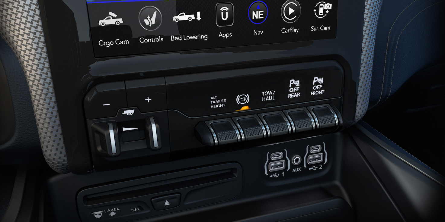 Once lined up, simply raise the suspension back to its normal setting and Ram and Airstream (or whatever you’re pulling) are linked. The entire process takes well under two minutes, though you still need to get out to manually check the hookup and attach the safety chains. It’s a killer app compared to the associated trailer data connectivity, impressive for its inclusion of things like realtime tire pressure on compatible rigs but lacking the advanced camera tricks of the GMC Sierra.