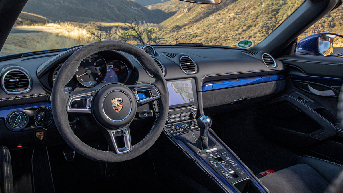 Dynamically, the Spyder’s sublime chassis benefits from the same hard-mount subframe, suspension, steering, and brakes as the GT4. Underneath, the chassis setups are also in parity, a 911 GT3-based front end and tuned, lighter-weight rear strut setup with smaller “helper springs” that pretension the lightweight main springs, holding them in place during full rebound. Porsche’s PASM sport active suspension comes standard, lowering ride height by 1.18 inches compared to a base Boxster and adding nuance the previous model’s single-stage dampers couldn’t muster.