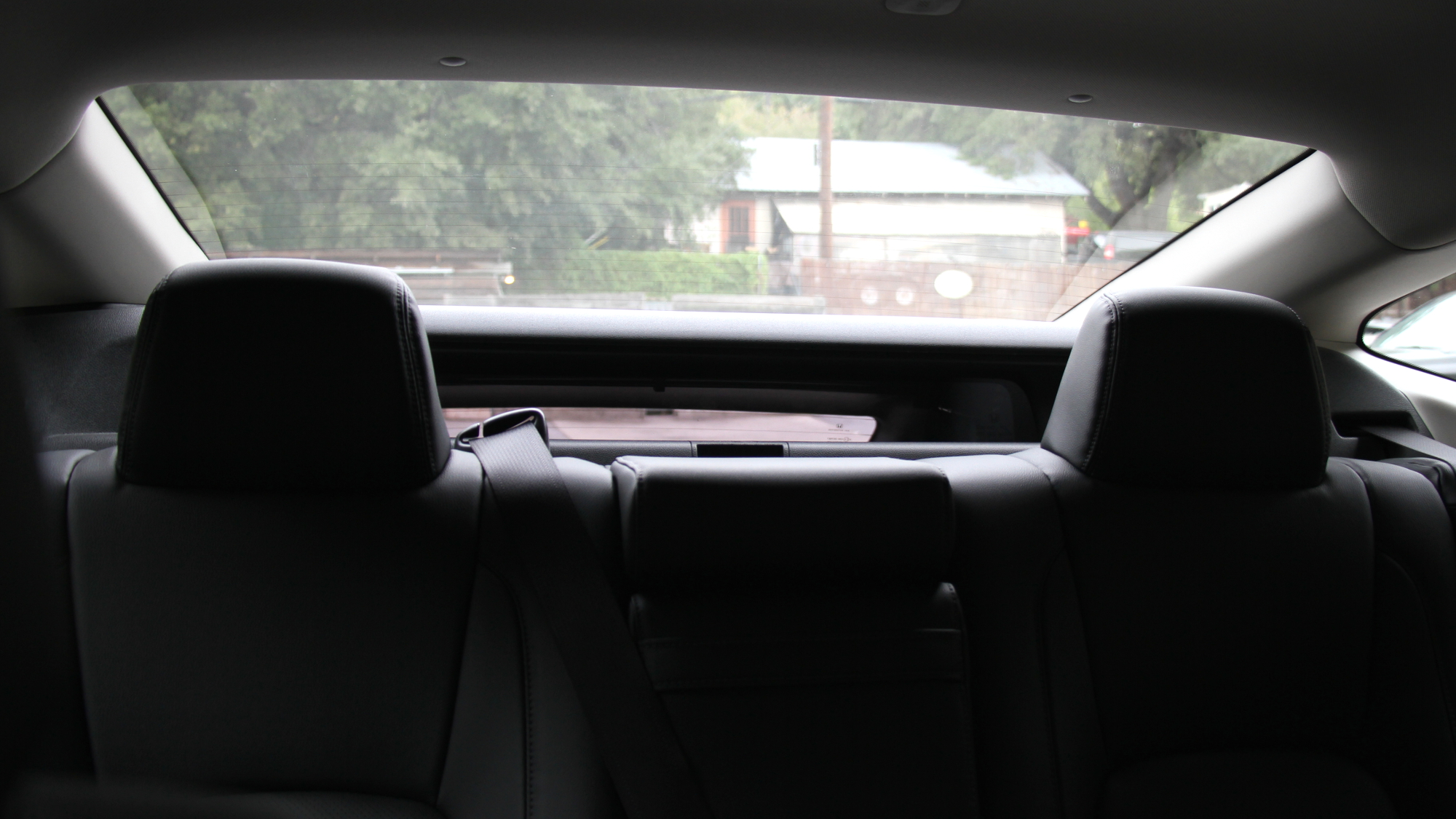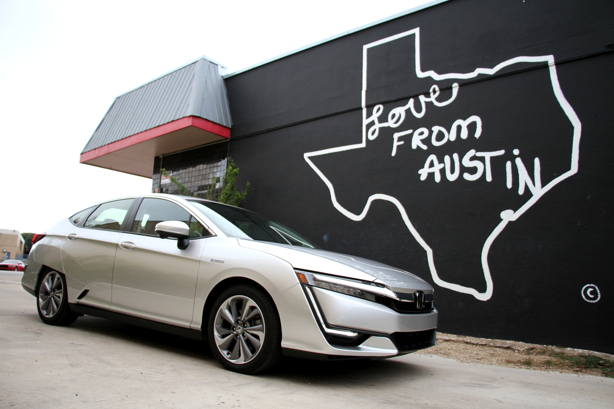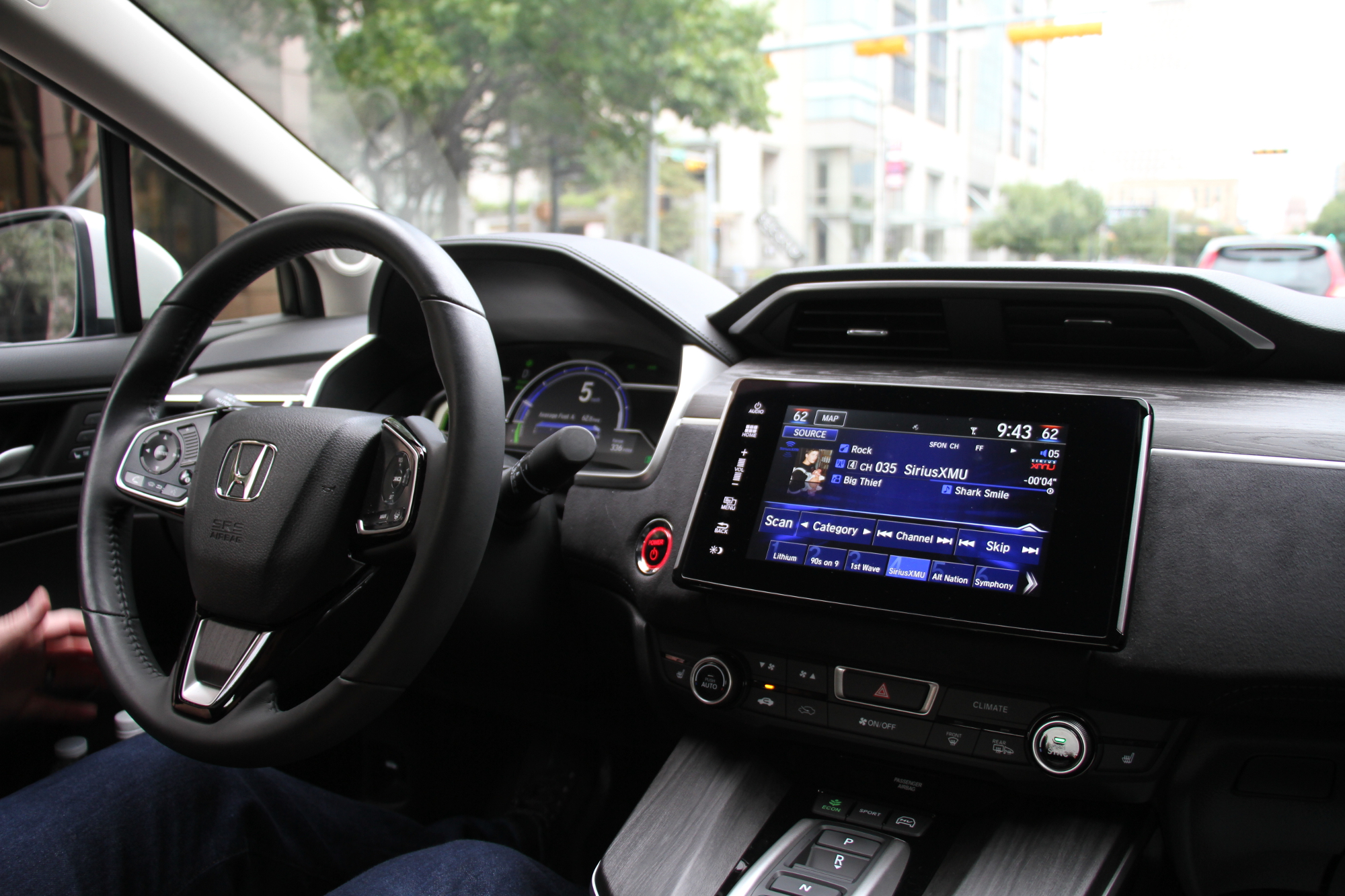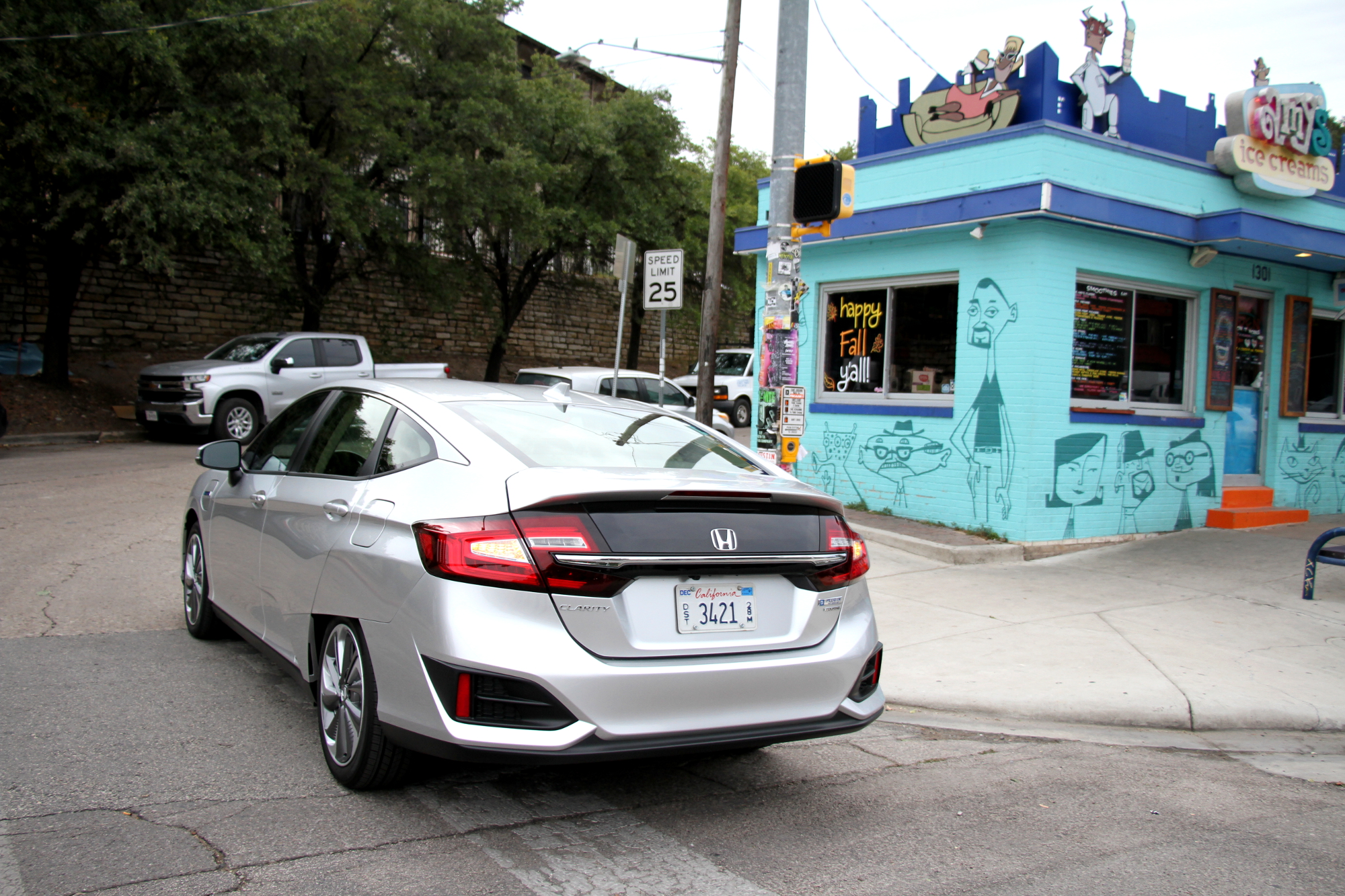 My only real complaint with the Clarity’s driving experience is its large turning radius. Turning around in some of Austin’s smaller downtown areas required multiple-point turns, and no, there isn’t a physical handbrake to make it any snappier either. If you’re an over-the-shoulder reverser, the view backwards is annoyingly bisected by the spoiler, though the lower window integrated into the rear deck lid is a handy touch. As with Honda’s other cars, there’s also a rear-facing camera mounted on the passenger side mirror to improve blind spot visibility.