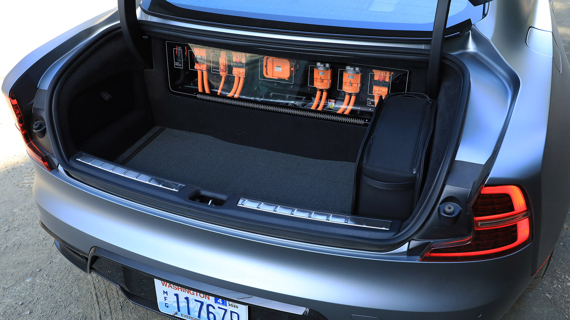Outside of a ten-tenths corner, though, the Polestar 1’s high-level grand touring experience is somewhat blunted by the powertrain. It’s a solid performer—even after the 34 kWh battery is depleted and the car is propelled solely by internal combustion—but the buzz of that four-cylinder mill is hard to ignore. It’s out of place in a vehicle that commands a six-figure price tag, and if you plan to drive it with at least some haste, that two-liter will be part of the power equation most of the time. Another bummer: valuable trunk space is eaten by a fancy hybrid component display, fun for a moment before you realize two pieces of carry-on luggage will barely fit in there.