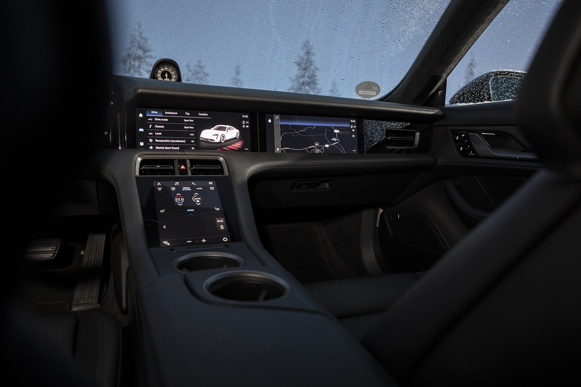 And it’s hard to discuss the braking performance of any of the available three systems because we only drove the six-piston system, and only on snow and ice. A surprising amount of pedal pressure is required to bring the car to a full stop in these conditions; we suspect it might have something to do with the fact that the Taycan 4S manages an astonishing 90 percent of “everyday” braking with just the energy-regeneration system. The pad wear is so low that Porsche specifies change intervals by time (six years). Some fine tuning is needed with the software. Our car was also fitted with N-Spec Goodyear Ultra Grip winter tires, which are available from Porsche and were a revelation in the snow.