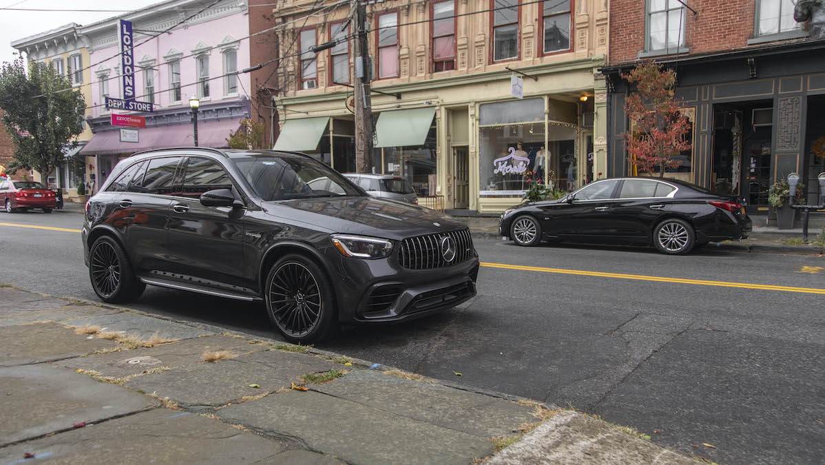 Aside from the typical visual cues, which are numerous, and the added track width, the GLC 63’s story leads with its AMG engine. It’s the familiar twin-turbocharged, 4.0-liter V8. While unchanged for 2020, the four liter can still alter the position of matter with the best of its kind. Producing 469 horsepower and 479 pounds-feet of torque, it delivers the upright GLC 63 to 60 mph in a gut-punching 3.8 seconds with launch control. The squash-top GLC63 Coupe, with its slightly lower center of gravity and availability in AMG’s S trim—with 503 horsepower and a savage 516 pounds-feet—does it in 3.6 seconds. Of the GLC 63’s family-moving competitors, only the Alfa’s 505-hp Stelvio Quadrifoglio gets from zero to 60 quicker, in 3.4 seconds.