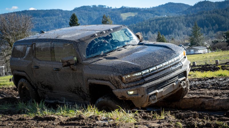 The centerpiece of the course was a 36 percent grade ascent immediately followed by an equally steep descent. I lined up the front end and shifted into low range—doing so is the only way to unlock that last extra inch of ride height and ground clearance in the adjustable air suspension. These camo’d test trucks weren’t AT4 off-roady models with larger tires and that high-clearance front bumper, so staying out of low range meant we’d either scrape the front on approach or get high-centered at the peak.