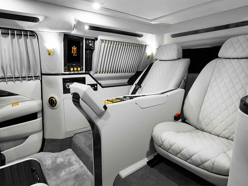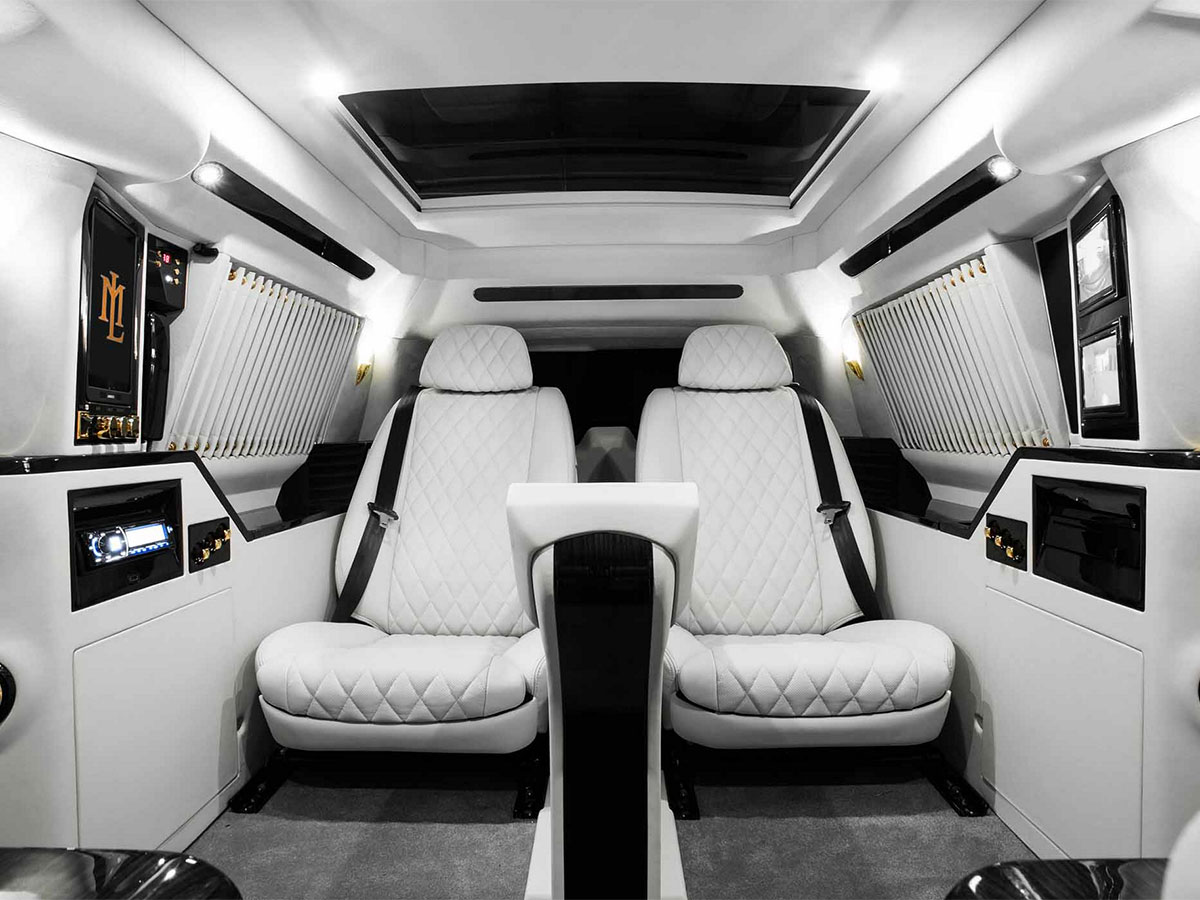 According to the company, the so-called Sky Captain was influenced by both “planes” and “pianos.” (We imagine an earlier vision board may have included “chandeliers,” “champagne,” “caviar,” “AK-47s,” “signet rings,” and “seal blubber hand cream.”) The jet apparently leant the idea for captain’s chairs and fold-down tray tables, while the piano lends its mirror-finish black trim. In the back, the white quilted-leather seats have heating and massage functions and are placed just behind a curving, 48-inch Samsung screen, for watching footage of your last whale hunting excursion or night club brawl. In a pinch, two jump seats fold down, Land Rover Discovery-style, for smaller children, larger dogs or lesser henchmen.