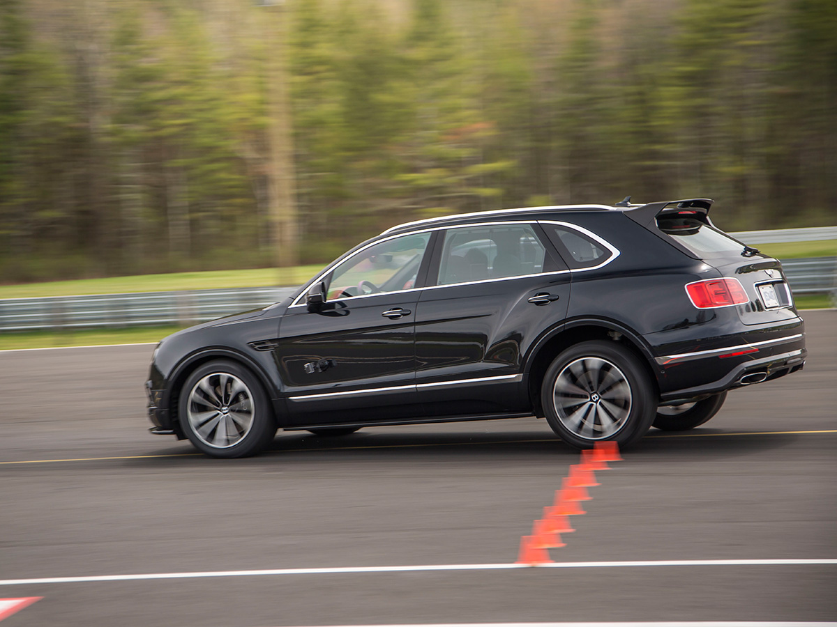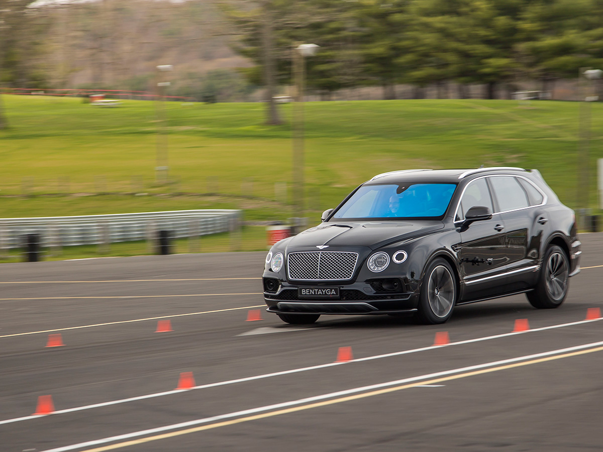 “The car wants to help you,” our instructor told us. “The more you can show it you know what you’re doing, the better it can aid you. When you’re railing the brake, and you’re giving definite steering input, it’ll recognize that and give you a little more control to help you steer the car through the stopping process.” Accurate. With decisive actions, the Bentayga dipped and swayed to a halt with ease, in a surprisingly short distance, only a whiff of vulcanized rubber wafting into the cabin. And these were not high-performance brakes, no ceramics here. Knowing that it’s indeed possible to stop a three-ton missile, we hopped on the track.