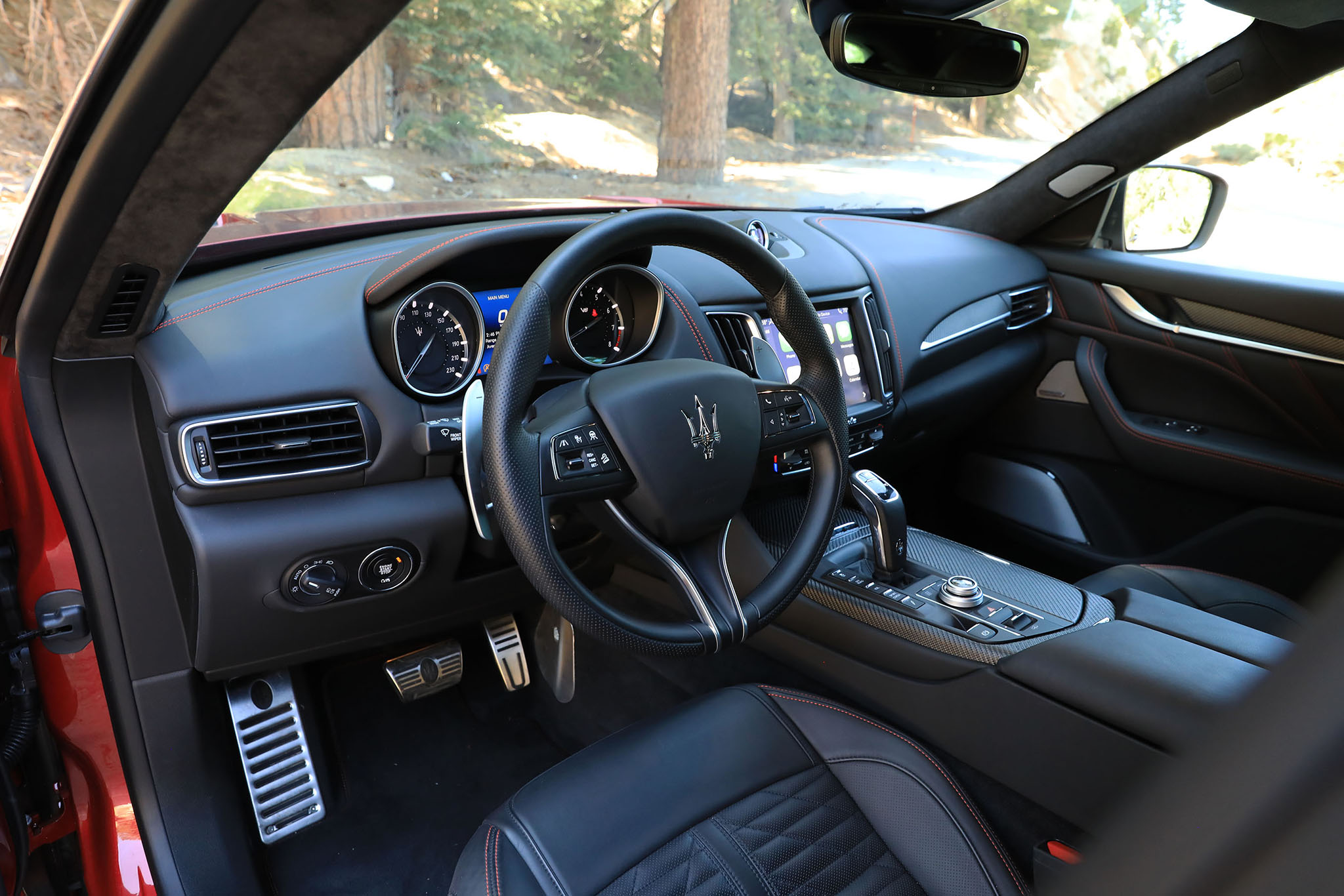 Item: Little touches exist to remind you that you’re driving something special, like big, column-mounted aluminum shift paddles that feel expensive to the touch. Sure, there’s Maserati badging everywhere you look, along with carbon fiber accents and full-grain “Pieno Fiore” leather, but that stuff is obligatory at this price point. Heat extractors that you can gaze into from the driver’s seat do a lot more for the exotic performance vibe than contrast stitching does.