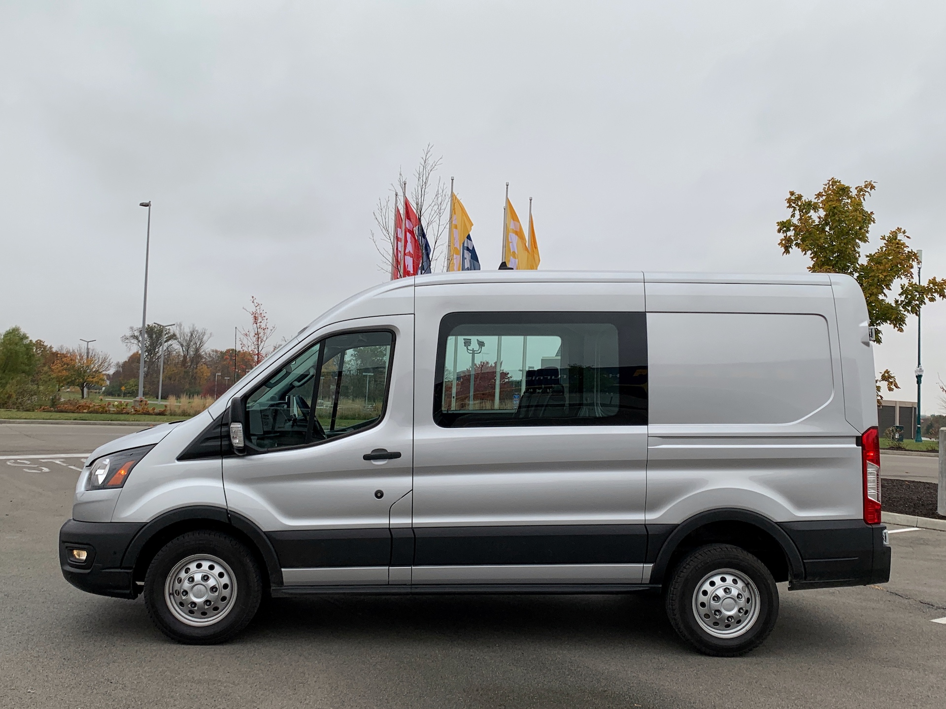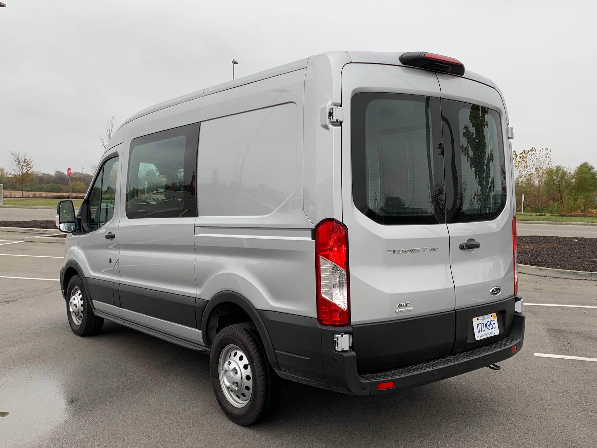 The tester Ford kindly dropped off at my house with a full tank of gas was a Transit 150 AWD with the medium roof and crew configuration. This breaks down into the following: it has all-wheel drive, sits at the entry-level of towing and payload capacity with its 150 designation (out of 250 and 350), a 130-inch wheelbase, medium-height roof, and crew bench seating.
