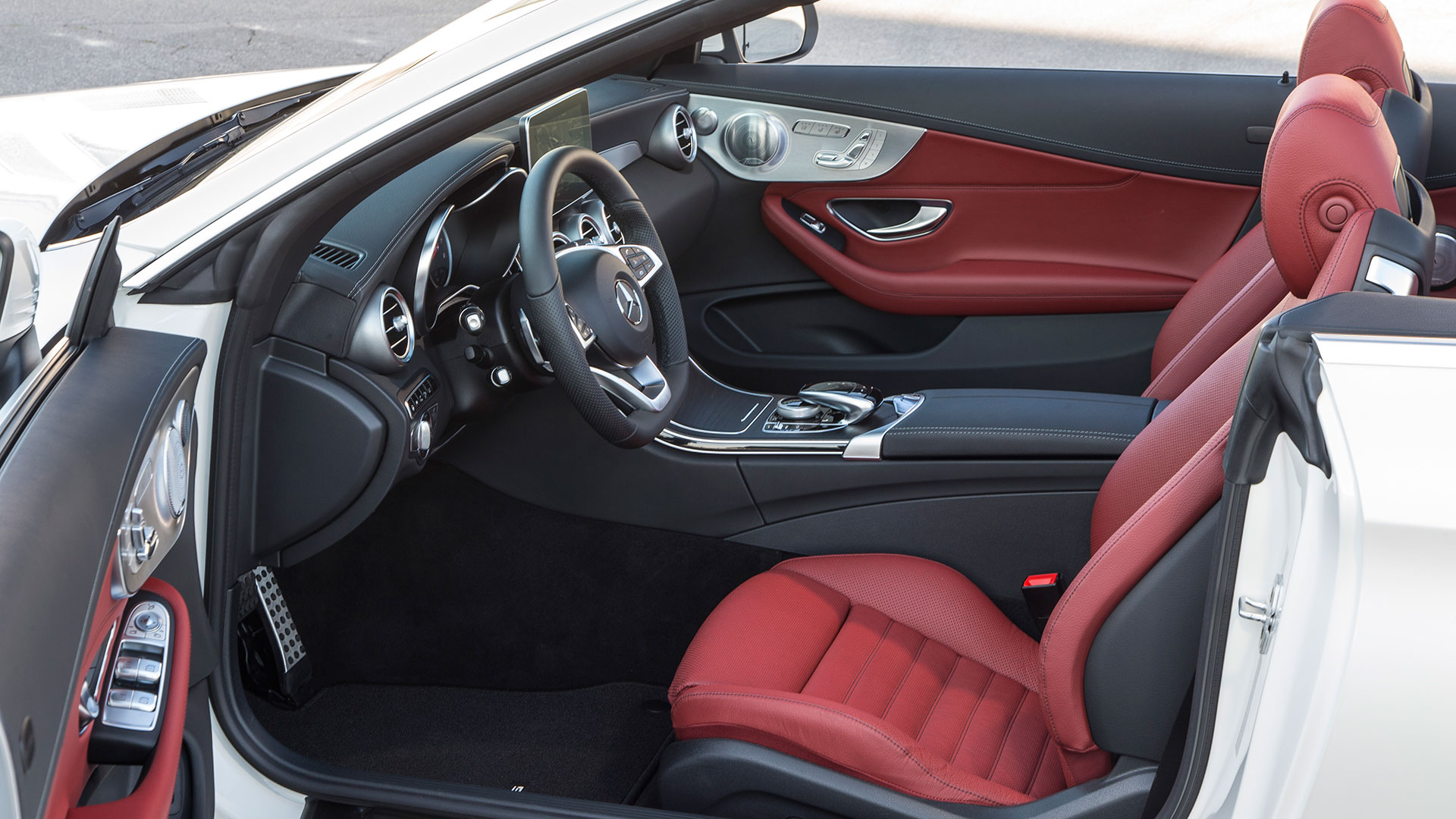 Walking up to a gleaming white example with twenty-inch multi-spoke wheels ripped from the S-Class, the dominant impression is of opulence. Unlike more muscled models up-range, the C300 would choose a beach cruise over a mountain sprint every time; like the 280SL Pagoda of the early Seventies, it has a few trappings of athleticism, but the temperament of Louis XIV. Inside, leather, matte-finish wood, and brushed metal soothe like the interior of a fancy shrink’s office, and of the many buttons, I could already see the go-to choices. Those would be the auto climate toggle, plus the holy trinity on the center console: the roof button (hold for 20 seconds), the all-windows-up button, and the Aircap button. The last is a combination of mesh screen and roof-mounted spoiler that prevents buffering in the cabin, even at highway speeds. It works—the only strain in your voice will come from yelling epithets at the C63 Cabrio driver that just roared past you in a cloud of glee.