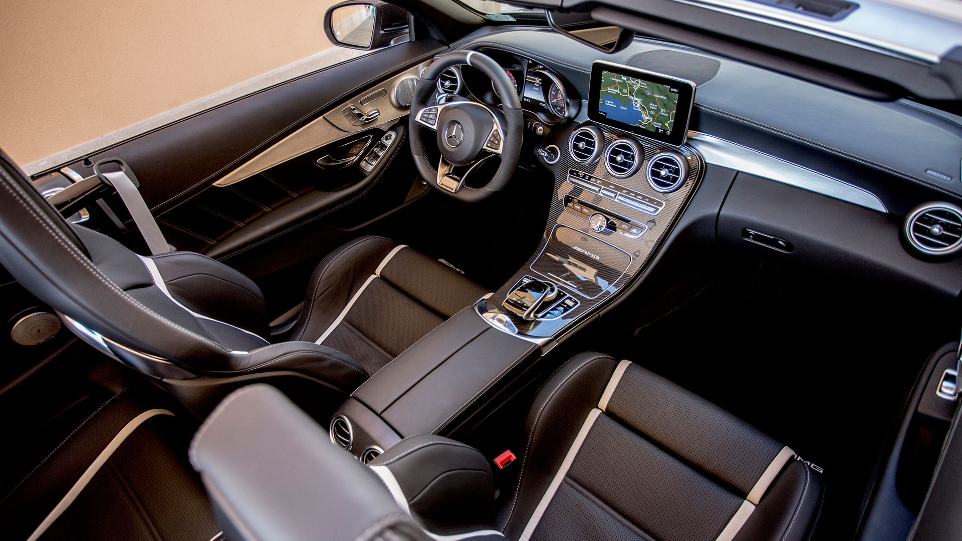 Driving excitedly (but gingerly) over Slovenian country roads (the beautiful nation has yet to bequeath its secondary roads with even a centimeter of shoulder) an entirely divergent personality emerges. If the C300 is old-school luxury—graceful, unobtrusive, coddling—the C63 is ludicrous, loud, and too powerful; near-frustrating in its potential. That visual superiority sets the stage for a much more beguiling experience. At turnover, the “hot-vee” turbocharged V8 rumbles as if it weren’t 2.2-liters down on the old 6.3-liter naturally-aspirated AMG motor, though engineers noted that the exhaust was tuned a couple of decibels down from the raucous C63 coupe so as not to give passengers tinnitus. Inside, there’s so much carbon fiber it’s as if, lacking a cow, Mercedes caught and skinned a Lexus LFA.