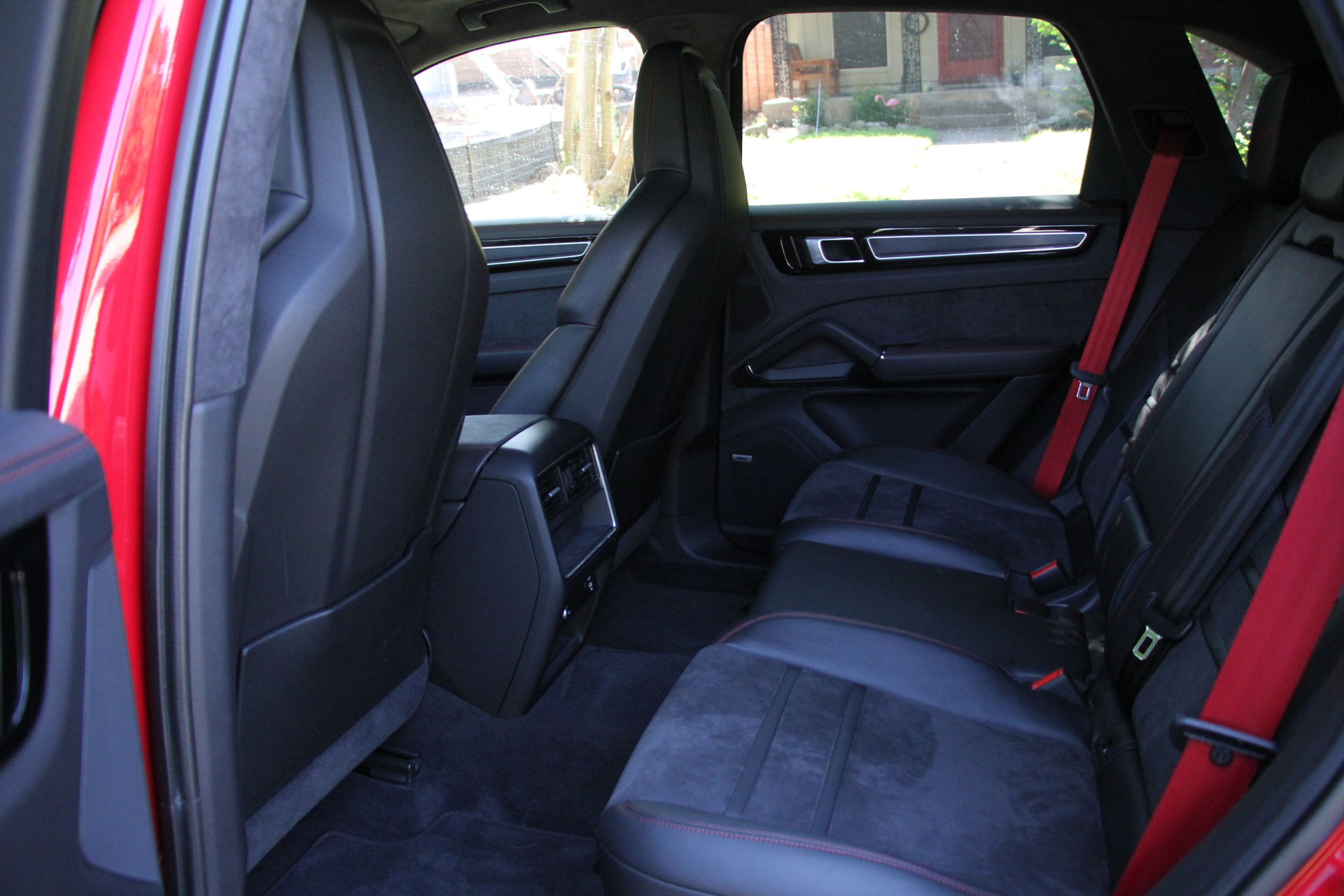 I tested this car in late spring in Texas, which means it was hot and sticky. The Cayenne doesn’t stay that way for long, with the HVAC system keeping up well with “we live in Satan’s groin right now”-grade heat. Shutting the sunshade over the lightly tinted panoramic glass roof helps considerably, but even if I forgot, it cooled down fast in the cabin. This Cayenne came with upgraded thermal- and noise-insulated glass ($1,130)—and it works. Plus, as much as people hate on racing-inspired nods like Alcantara interiors in an SUV, Porsche’s fuzzy Race-Tex fabric cools to the touch much faster than hot leather.