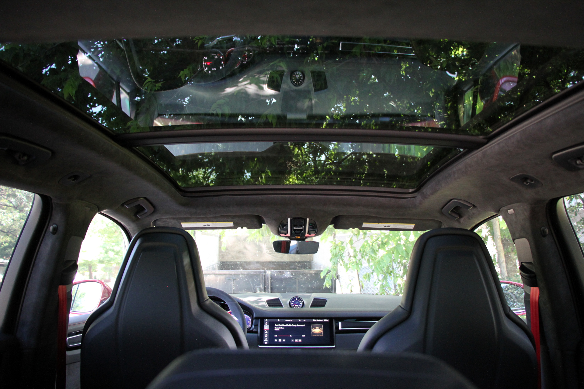 There’s also a profoundly comfortable ride. The seating position is natural-feeling without that “I’m sitting on a barstool” effect that many SUVs have for shorter drivers like me. I’m no audiophile, but the standard Bose surround sound system on this car was more than enough to envision myself way down yonder on the Chattahoochee, except Alan Jackson’s iconic ripped jeans would be made of Alcantara in here. The panoramic glass roof made it feel airy and light inside despite having a black interior. I could even set the HVAC system to blow more softly, even at higher fan speeds—lest we mess up the gross rat’s nest that’s called “my hair.” Everything can bend to your will in Cayenne Land.