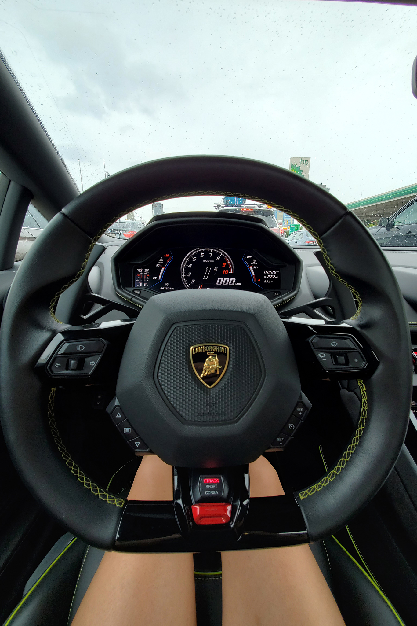 In the tamest Strada mode, the roar clips down to a purr and the Lamborghini does its best to behave. It’s a convincing show, too, with the angular body slipping past the unsuspecting. In these cases, the car’s design shouts far louder than its exhaust does. It draws eyes wherever it goes, however, and it’s a little bit like being famous.