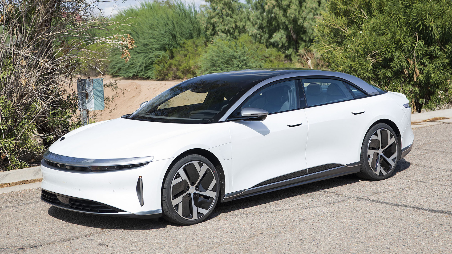 It also caps the output at 670 hp, but even in its most relaxed setting, the Air had no problem smacking the back of my noggin into the headrest from a 40 mph roll, and triple-digit speeds arrived in stunningly short order. As with most EVs, the silence can be disarming; the Air’s well-isolated cabin blocks out the vast majority of road noise, and the barren Arizona desert doesn’t provide a ton of visual cues that give you a real sense of the speed that you’re carrying. More than once, I wondered if the speedometer was measuring kilometers rather than miles. It wasn’t.
