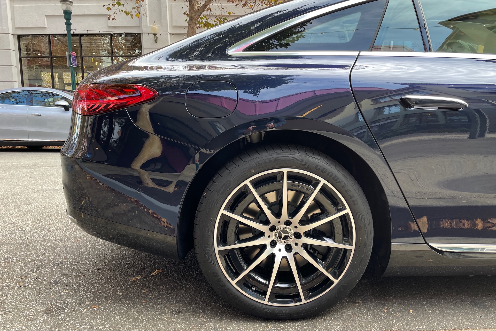 Just looking at the EQS, you can tell something’s different between it and other Mercedes cars. Besides the A- and C-pillars that have been scooted forward and back, respectively, to create more cabin space, the profile is distinctly rounded in shape. Much of the front facia is closed off and can reportedly achieve a very slippery drag coefficient of 0.20 when equipped with the relevant wheel and tire package. The wheels, flush with the body, can be had in either 20-, 21-, or 22-inch configurations.
