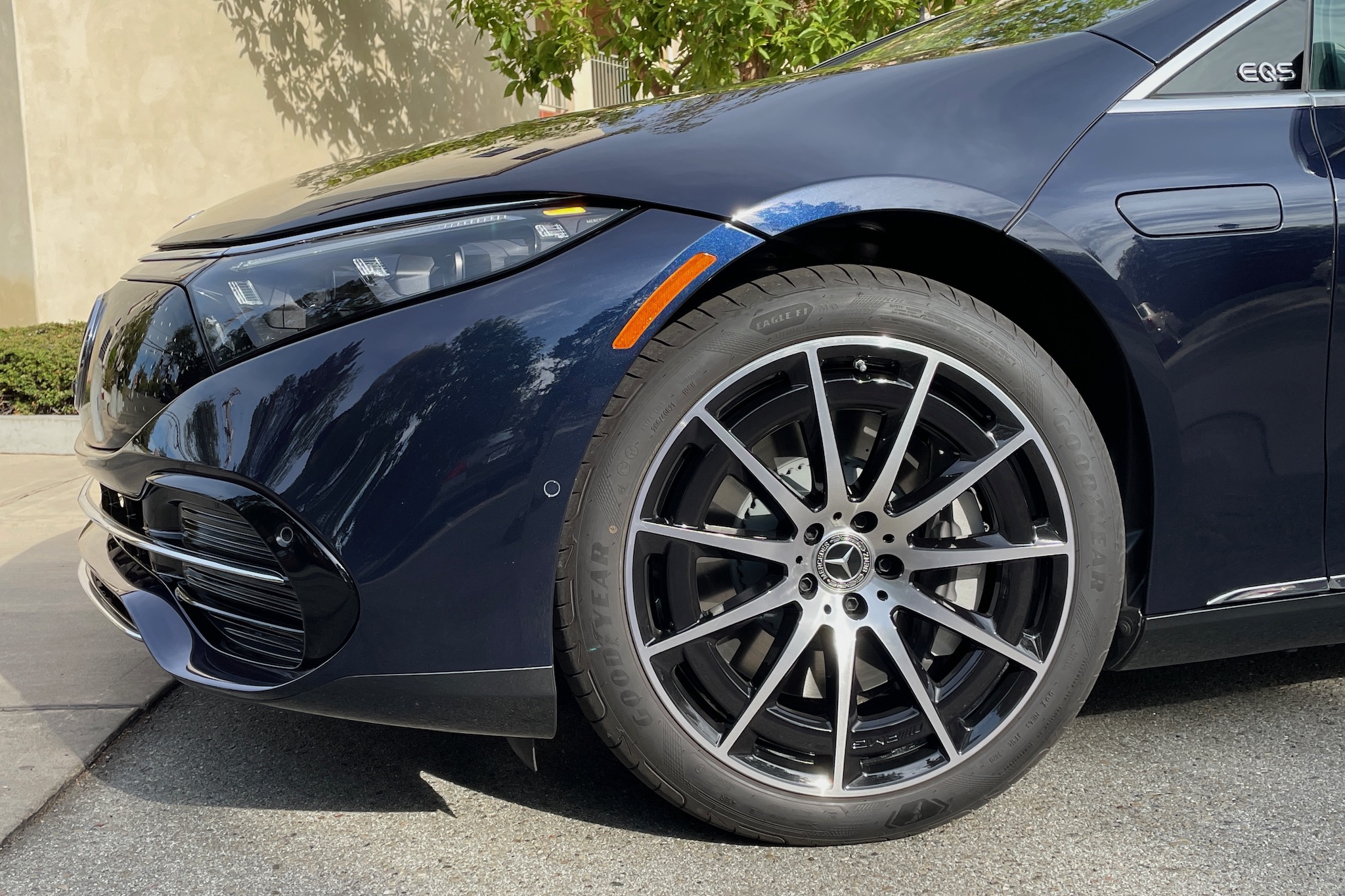 Speaking of standard equipment: The rear-wheel-steering system is bundled with every EQS sold here in the U.S. With up to 10 degrees of rear steering, it gives the big-bodied EQS a turning circle and low-speed maneuverability akin to a compact car.