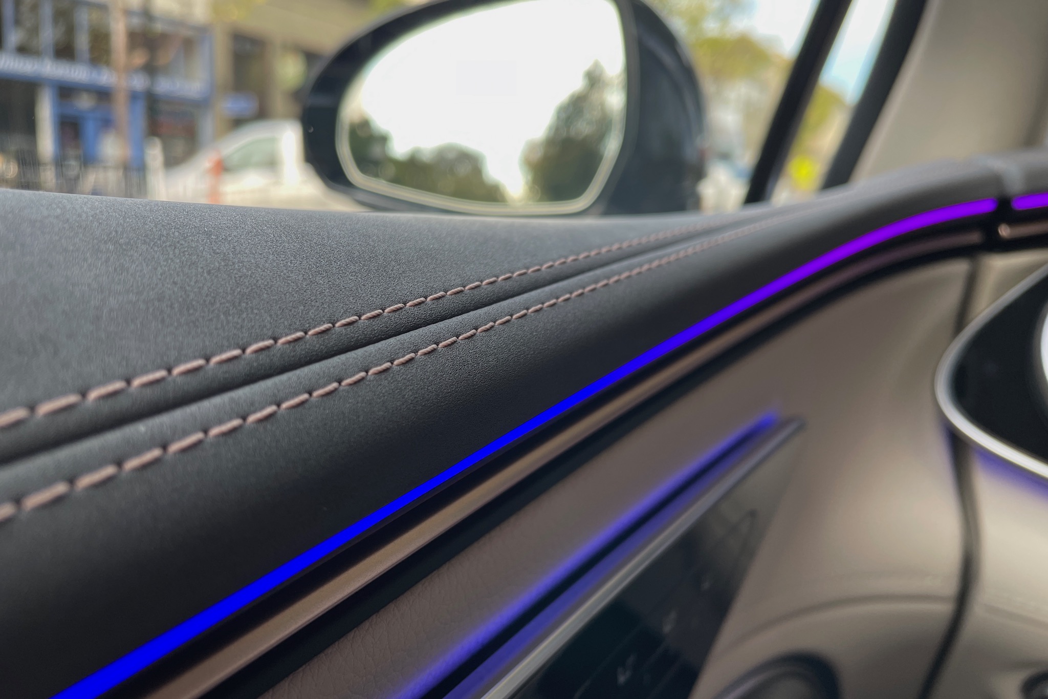 As well as the EQS drives, the biggest draw of this car, as far as I’m concerned, is the interior. It is, in a word, heavenly. I love the materials, I love the club lighting that’s visible during the day, I love the stitching, the wood, and the bronze trim that spans the vents and extends into the door cards. Interior build quality, criticized on some Mercs of a lower caliber, is first-rate with nary a creak or rattle to be heard even when surfaces are purposely pressed, yanked, and jiggled.