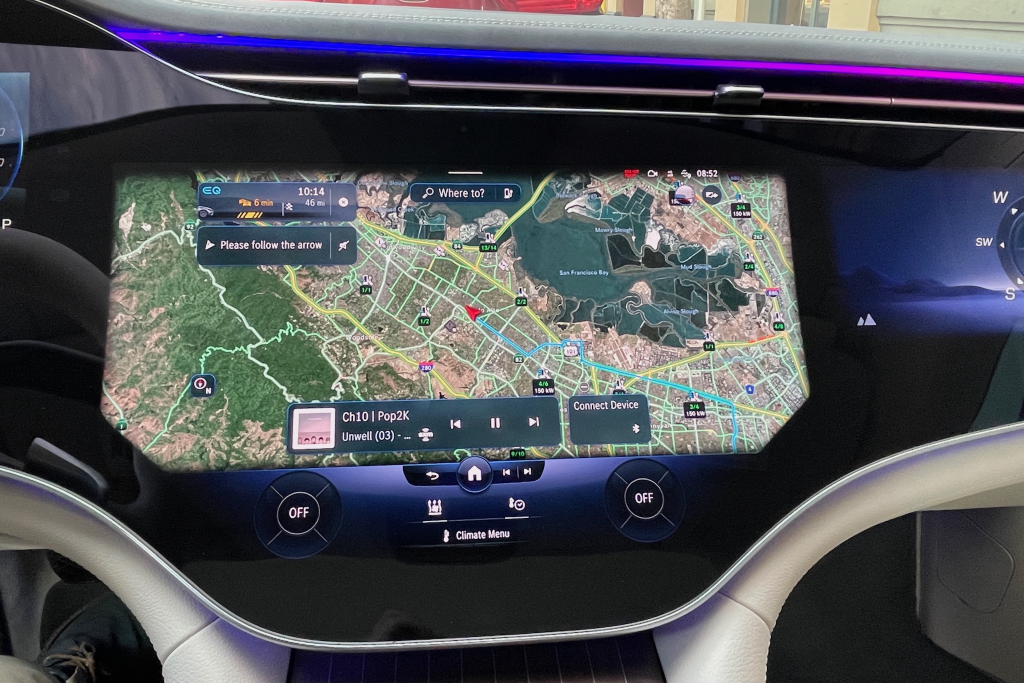 Triggered by a long-press of either paddle, intelligent recuperation can seamlessly adapt and adjust between no regen (for more efficient highway coasting, for example) and gradually stronger regen (in the city, and when it detects the car in front slowing down or coming to a stop). Granted, the smart braking system won’t stop for red lights or stop signs if there’s no car in front of you, and has no governance over the accelerator. But it’s extremely—nay, uncannily—good at modulating your speed in sync with traffic and, unless something unexpected happens or you do it on purpose, makes it virtually impossible for the EQS to rear-end anybody. Its operation feels completely natural, too. Drive with intelligent regen on without mentioning it to your passengers and they’d be hard-pressed to know anything is up.