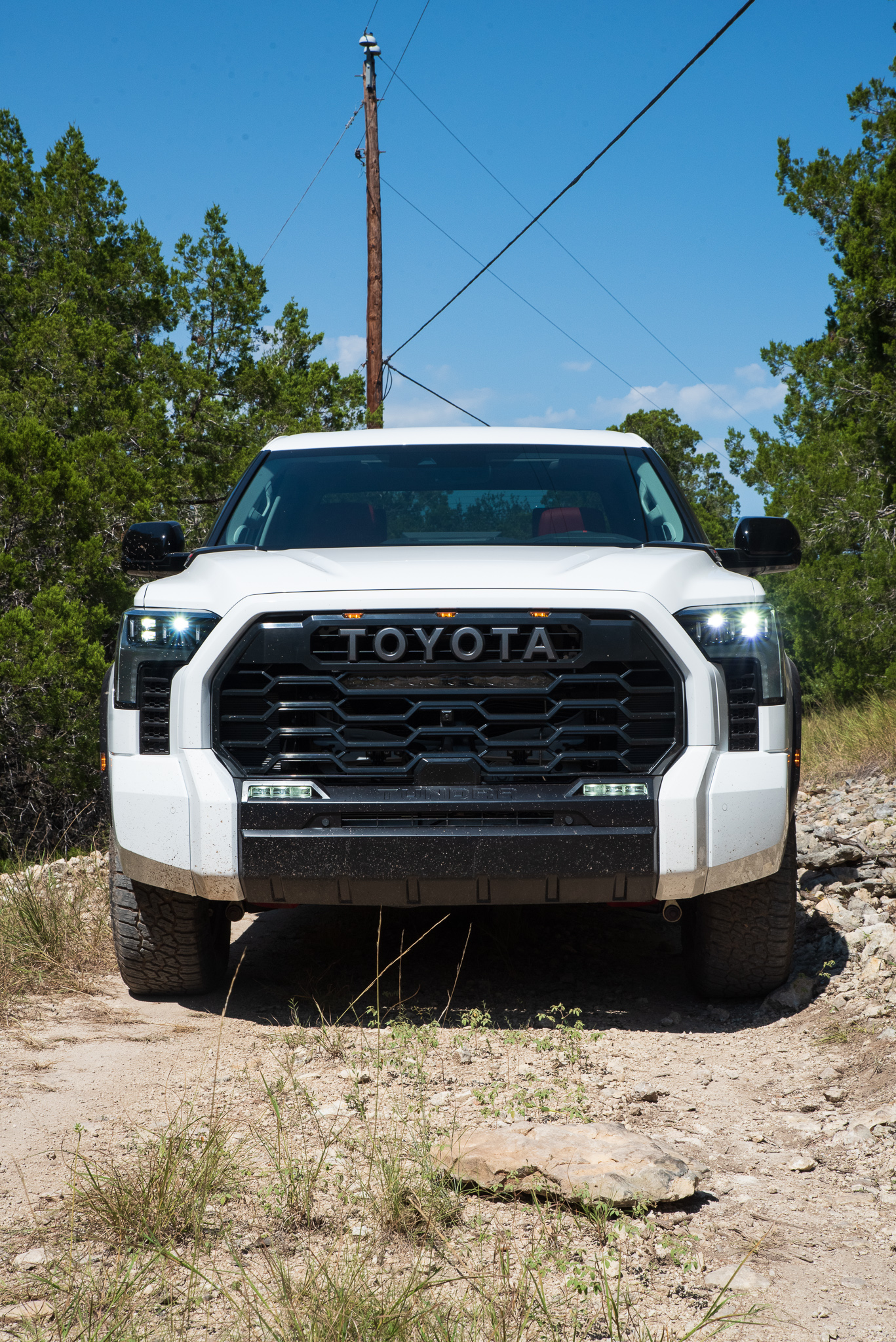 With a 1.1-inch suspension lift and those 33-inch Falken Wildpeak AT rollers, the Tundra TRD Pro’s running ground clearance measures 10.9 inches. That’s a little less than the Silverado ZR2 offers (11.2 inches), and you’ve gotta keep in mind the Tundra’s size. From front to rear, it measures 233.6 inches; that’s 2.5 inches longer than an F-150 Tremor, and the outgoing Tundra was just 228.9 inches. It’s also wider than the pickup it replaces, meaning you’ll have to embrace the pinstripes if you follow your buddies through the thicket. With its hybrid powertrain and underbody cladding, the TRD Pro tips the scales at just over 6,000 pounds—not Hummer heavy, but still a lot.